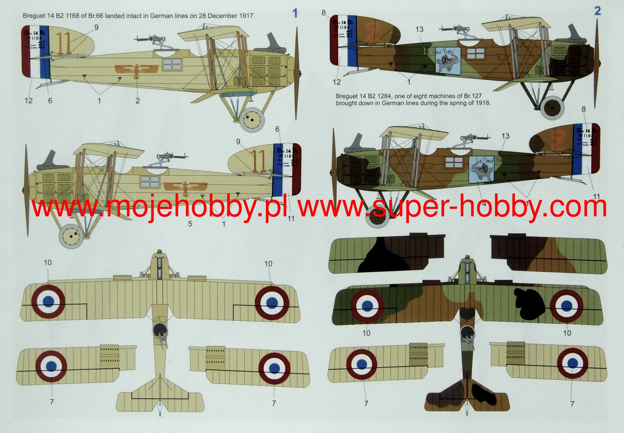 The Breguet 14 (or Breguet XIV or Bre.14) was a French reconnaissance aircraft and light bomber from World War I and the interwar period. The machine was built in a biplane system, it had a mixed structure and a classic - fixed undercarriage. The prototype flight took place in 1916, and serial production started in 1917. Approximately 8,000 aircraft of this type of all versions were created during it. The drive - in the B2 version - was provided by a single engine Renault 12Fe with a power of 300 hp. The deck armament consisted of three 7.7 mm machine guns. The machine could carry a load of bombs weighing up to 300 kilograms. The Breguet 14 was developed by Louis Breguet in response to the requirements set by the French military aviation for a new light bomber plane. The machine marked the return of this great aviation constructor to the plane with a towing propeller, as well as the large-scale use of duralumin, which was a novelty among aviation constructions of that time. The machine also had good flight range and performance. It is widely recognized as one of the best light bombers of the First World War. In the course of serial production of this successful aircraft, many of its development versions were created, including: Bre.14 A2 (reconnaissance version), Bre.14 B2 (bomb version) or Bre.14S (sanitary version). Airplanes of this type were used, inter alia, in the military aviation of Belgium, Spain and Poland. The last copies of this aircraft were withdrawn from the Polish airline service by 1932.