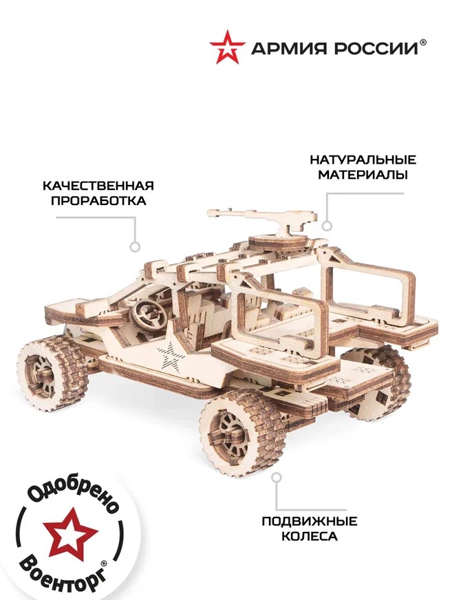 Описание Деревянный конструктор и сборная модель из дерева Автомобиль, Внедорожник, Тактический Вездеход "Армия России" для детей и взрослых. Тактический Внедорожник "Армия России" - это вездеход, который может использоваться в самых экстремальных условиях. Специальная проходимая техника для песков, дюн и болотистых местностей. Готов к любым военным миссиям. Модель схожа с российской разработкой Чаборз М-6. Все детали выполнены из качественной древесины и имеют сильный насыщенный запах дерева. Готовы к сборке. Детали находятся на специальных плашках и необходимо только выдавить пальцем нужную деталь. Особенности: - Крутятся колеса - Проработанная детализация - Легкая сборка без клея Любой конструктор после сборки можно раскрасить акриловыми и гуашевыми красками, но даже без этого в результате получается полноценная красивая игрушка с подвижными элементами. Возраст: от 5 лет. Кол-во деталей: 69 шт. Размеры: 110х60х55 мм.