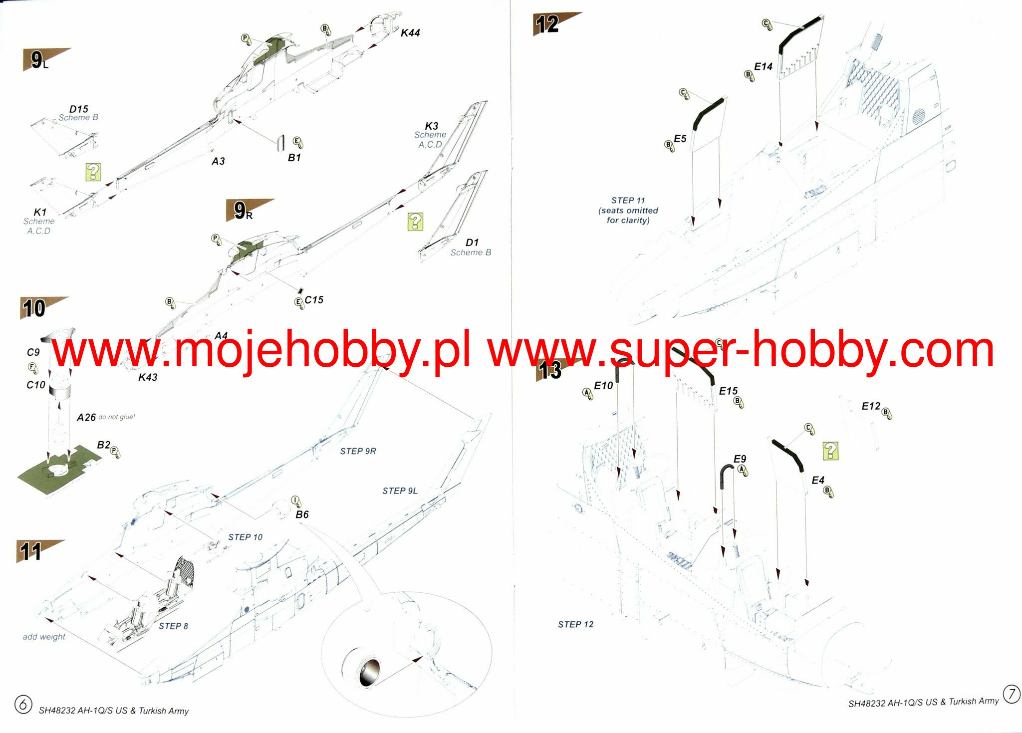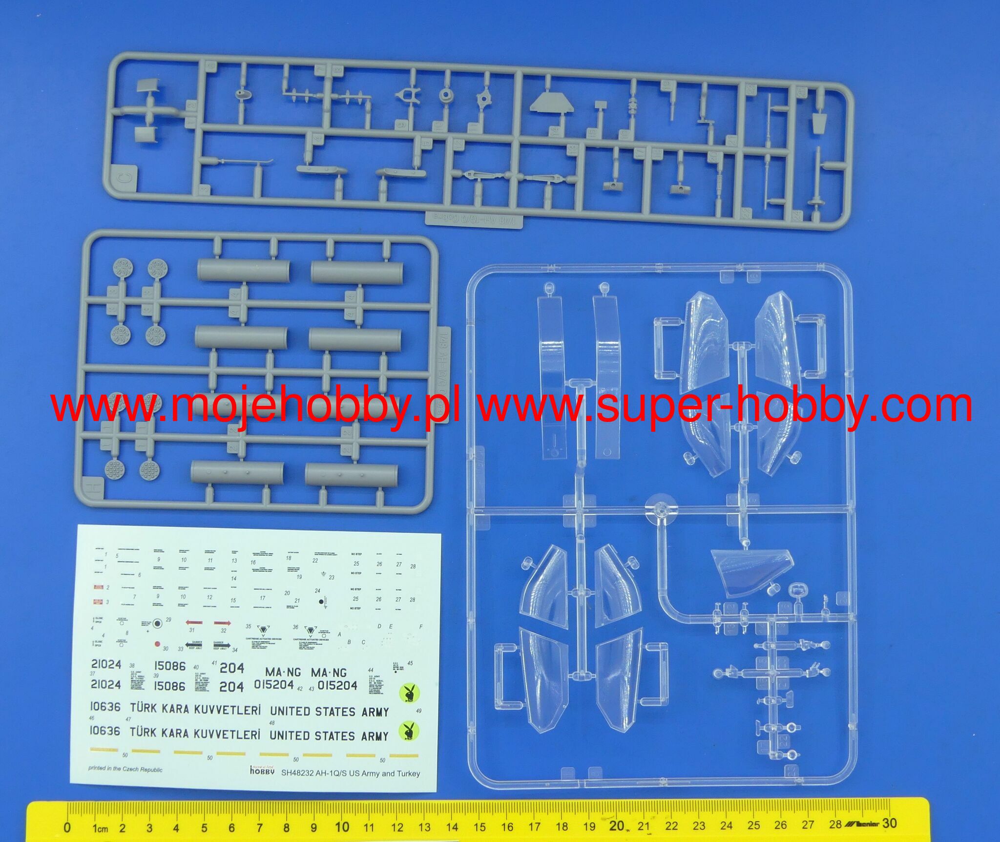 The AH-1 Cobra helicopter (Bell 209) is an attack helicopter in the classic layout, using many components of its "big brother" UH-1 Huey. The first flight of the AH-1 prototype took place on September 7, 1965 and the helicopter entered mass production in the same year. During the Vietnam War, 1,126 machines of the G model were produced, of which 279 were lost in combat. Due to the very high reliability of the structure, small side profile and good performance, the helicopter remains in service to this day in the US Marine Corps. The AH-1 allowed the US Army to fully implement the theoretical assumption of airmobile infantry ("air cavalry") through the fire support of landing infantry units. Today, the AH-1 Cobra is primarily used against an armored celon. From 1965, several versions of this successful helicopter were created, including: AH-1G (basic version), AH-1J (two-engine version), AH-1Q (version armed with TOW missiles). Technical data: Top speed: 333 km / h; maximum range (depending on version): 507-574km, armament: fixed-1 20mm M197 three-barrel cannon, slung rockets, guided missiles, unguided missiles and cannon pods. sph48232-instruction.pdf
