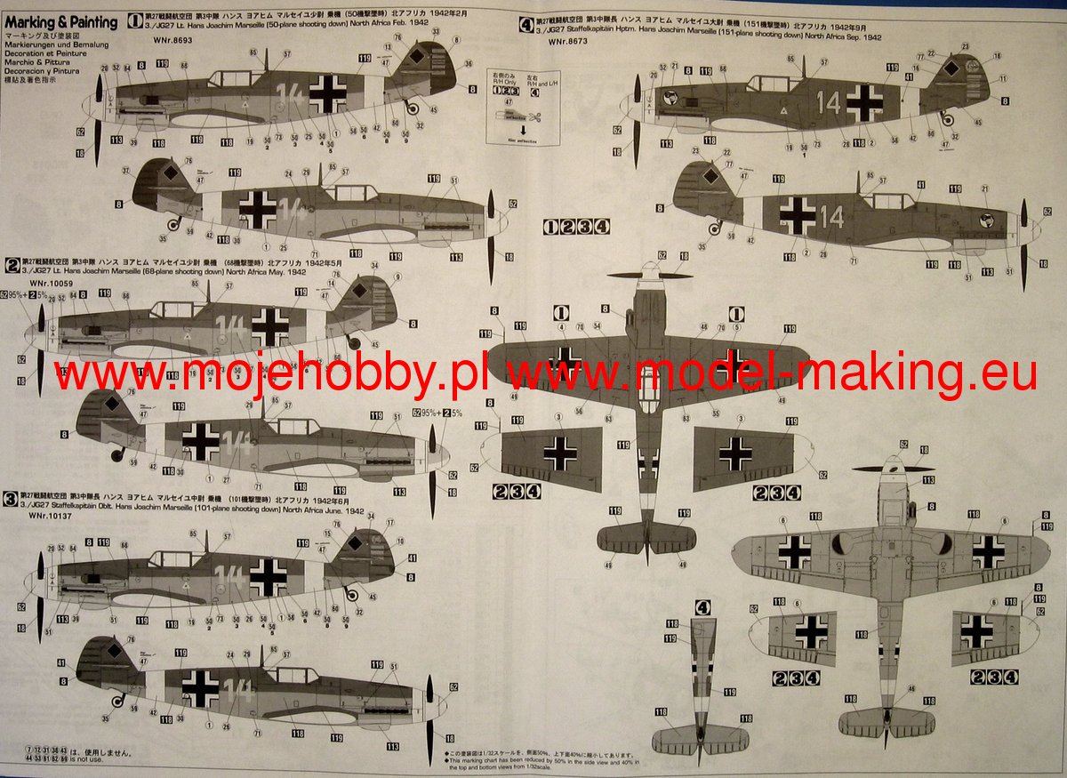 The Messerschmitt Bf-109 is a German metal-structure single-engine fighter in a low wing configuration with a classic tail. It turned out to be the basic and most produced Luftwaffe fighter during World War II. The flight of the prototype took place on May 29, 1935, and serial production continued in the years 1936-1945. In total, it is estimated that a total of about 35,000 Messerschmitt Bf-109 fighters of all varieties were produced, many of which ended up in the Czech and Israeli air forces after the war. The roots of the Bf-109 go back to the competition announced in 1933 by the Luftwaffe for a new fighter plane. In competition with the He-112, the Bf-109 project initially lost, but thanks to Willie Messerschmitt's intrigues, the project could continue and eventually he was the winner of the competition, becoming the Luftwaffe's primary fighter. Several main variants of the Bf-109 were developed in the course of production. The first pre-production series was the Bf-109B (Berta) with different versions of the Junkers Jumo 210 (A or Da) engine. They were tested in Spain from 1937 during the Civil War. The next version is the Bf-109C (Caesar). They had a different engine than the B version, and extensive armament consisting of two 20mm and 2 HP 7.92mm cannons. These machines also fought in the skies of Spain. The third version is the Bf-109D (Dora) with the Junkers Jumo 210 Da or Daimler-Benz DB 600 engine. It fought in the September campaign, but at the turn of 1939/1940 it was replaced by the E version. The most famous model was the Bf-109E (Emil) with a Daimler-Benz 601A or N engine. It was the first to use a three-blade, not a two-blade propeller. Bf-109E fought in the French campaign, over England, and in North Africa and on the Eastern Front. The ace who started his career on the Bf-109E was the famous Adolf Galland. The next version is the Bf-109F (Friedrich), which, according to the German pilots, was the most aerodynamically perfect. It sowed the changed shape of the fuselage, wings, cabin fairings, but no new engine was used. It was put into service at the turn of 1940/1941. As part of the development of the design, further Bf-109 specifications were developed, of which the G (Gustav) version was produced in the largest number of copies. The most important change increasing the machine's performance was the installation of a new 12-cylinder Daimler-Benz DB605A engine with 1475HP. The armament of the Bf-109G was a pair of 13mm machine guns located in the fuselage in front of the cockpit fairing, and the MG151 20mm or heavier MK108 30mm cannon. The last mass-produced version was the Bf-109K (Kurfirst), which production started in October 1944. A Daimler-Benz DB 605DB or DC unit was used as the engine. The Bf-109K was the fastest version produced during World War II, reaching up to 730 km / h. Apart from that, two versions were created - H and Z, but they were rather experimental versions and their mass production did not start. Subsequent improvements in propulsion and armament made the Messerschmitt Bf-109 one of the most dangerous fighters of World War II, and at the same time showed the great potential of the slightly angular airframe created by Willi Messerschmitt. Technical data (version Bf-109 G-6): length: 8.95 m, wingspan: 9.92 m, height: 2.6 m, maximum speed: 640 km / h, rate of climb: 17 m / s, maximum range: 850 km, maximum ceiling 12000m, armament: fixed - 2 MG131 13mm machine guns and 1 MG151 20mm cannon, suspended - 250 kg bombs, or 2 Wfr missile launchers. Gr. 21.