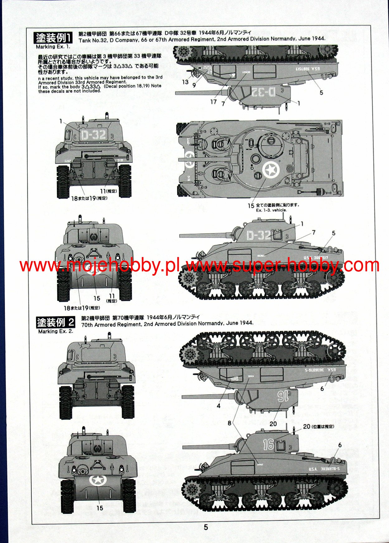 The M4 Sherman was an American medium tank from the Second World War. The first prototypes were built in 1941, and serial production was carried out in the period 1942-1945. In total, about 49,000 copies of this tank of all versions were created, which makes it one of the most produced tanks of the Second World War and the most important tank in the equipment of the Allied armies during this conflict. The M4 Sherman was powered by a single engine version of the M4A1 Continental R 975 C4 with a power of 400 hp . The vehicle was armed with - depending on the version - a single 75mm M3 cannon or a 76mm M1 cannon or a 105mm M4 howitzer and two 7.62mm Browning1919A machine guns. The M4 Sherman was developed as the successor to the M2 and M3 tanks, although it used many of the latter's components. First of all, it only used a slightly changed chassis of the M3 Lee car. When designing the M4 Sherman, the emphasis was primarily on playing the role of an infantry support vehicle, and not fighting enemy tanks - this was the role of American tank destroyers. Only possible clashes with the carts were assumed Pz.Kpfw III and Pz.Kpfw IV. A significant role was also played in the mass production of the new tank and the lowest possible production costs. The result was a tank with good armament for 1942 and early 1943, average armor, but with a tilted front plate, but also with poor maneuverability and - especially in the first versions - very susceptible to fire as a result of hitting the engine compartment . At the same time, however, a tank was created that could be truly large-scale production and had a significant modernization potential. Many development versions were created in the course of serial production M4 Sherman. Chronologically the first was the M4A1 version that already had a cast armor. Another - M4A2 - had welded armor and a new General Motors 6460 engine with 375-410hp, but much less prone to fire. A version of the M4A3 also appeared, armed with a 105 mm howitzer and powered by a Ford GAA engine with a capacity of 450 HP. Based on the M4A3 version, two sub-versions were created: the M4A3E2 Jumbo with reinforced armor and the M4A3E8 with the HVSS and 76mm gun. An interesting development version was also the T34 Calliope with mounted missiles not guided on the turret. The M4 Sherman was also supplied in huge numbers to the British and Red Army. The former developed a version of the Firefly based on it, with a great 17-pounder anti-tank gun. During World War II, M4 Sherman tanks fought in North Africa (1942-1943), Italy (1943-1945), during the battles in Normandy, France and West Germany (1944-1945), but also in the Pacific or in the ranks The Red Army on the Eastern Front. After World War II, the M4 Sherman was used in many countries, including Argentina, Belgium, India, Israel, Japan, Pakistan and Turkey. He also took part in many post-1945 conflicts, including the Indo-Pakistani War of 1965 and the Six-Day War of 1967.