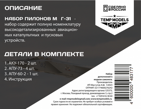 Описание НАБОР ПИЛОНОВ М&Г-31 - набор содержит полную номенклатуру высокодетализированных авиационных катапультных и пусковых устройств.