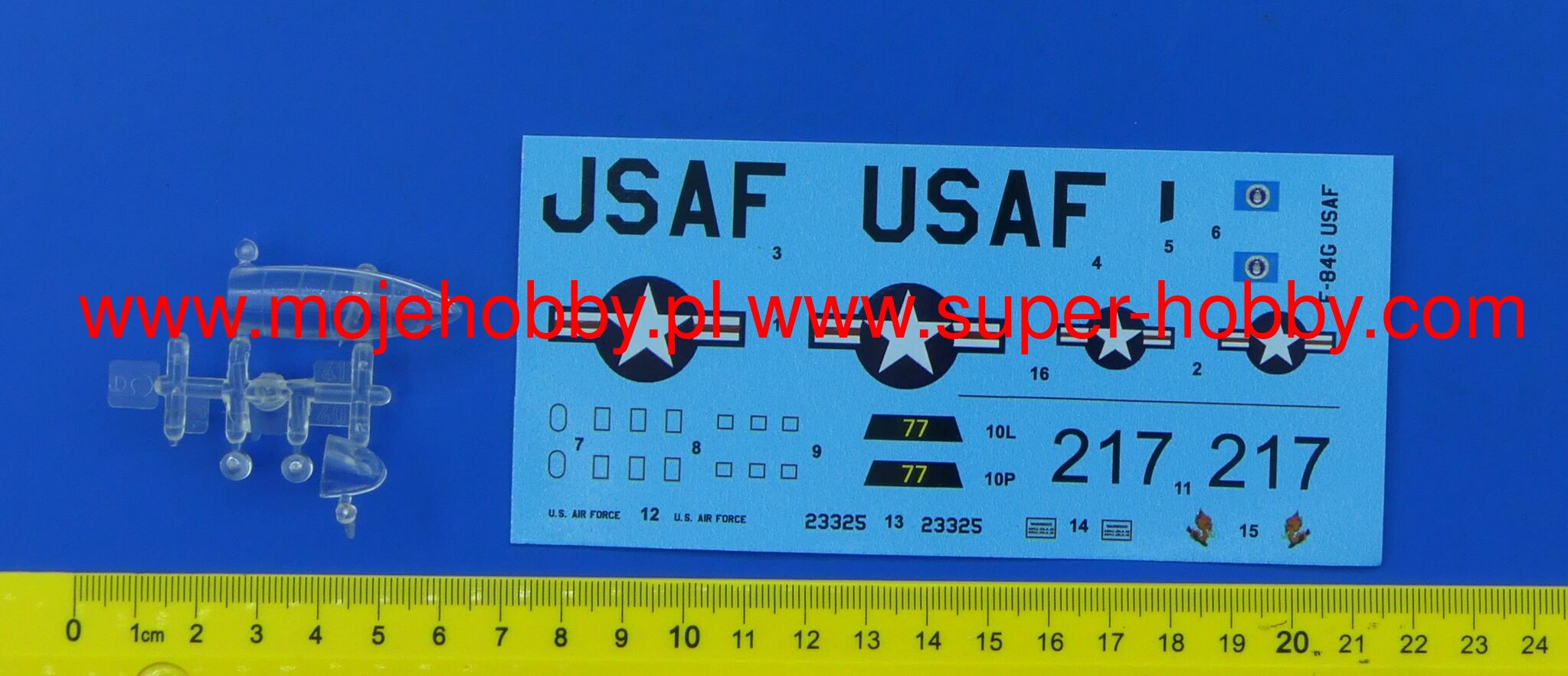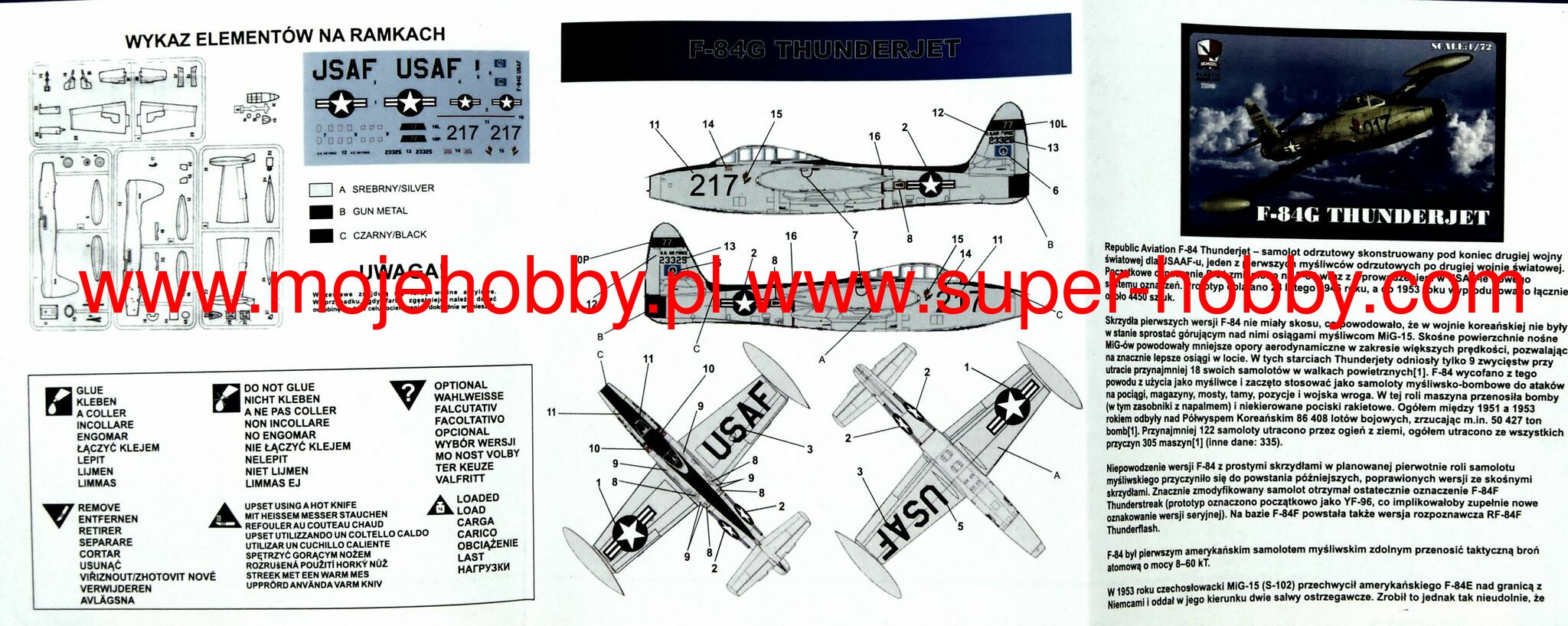 The Republic F-84 Thunderjet is an American single-seat, single-engine fighter-bomber. It was one of the first jet-powered fighters in the service of the US Air Force. The flight of the prototype took place in February 1946, and by 1953, 4,450 examples of this aircraft were built. Originally it was supposed to be called P-84, but it was eventually changed to F-84. The F-84E variant had a 12-inch longer fuselage in the pilot's cockpit to make flying more comfortable. The capacity of the fuel tank has also increased. The under-wing knots were also redesigned so that it was possible to carry additional fuel tanks instead of bombs. Far-reaching changes affected the F-84F Thunderstreak version, which received oblique wings, a new engine and served primarily as an attack aircraft. The "G" model has also undergone more in-depth changes. First of all, it received a new Allison J35-A-29 engine with a thrust of about 2650 kg, which increased its top speed to 1000 km / h and a range of 1600 km. The F-84G was also the first fighter capable of carrying nuclear weapons. F-84 aircraft were used on a large scale during the Korean War. In the first period of the conflict, they performed fighter functions, but as a result of the disastrous balance of air fights with the Mig 15s (8 victories against 64 lost planes), they quickly switched to the role of reconnaissance and attack aircraft. Technical data (F-84G version): Maximum speed: 1000 km / h, speed of climb: 19.1 m / s, maximum ceiling 12 350 m, maximum range: 1600 km, armament: fixed - 6 M2 Browning 12 machine guns, 7mm, sling - up to 2020kg of bombs and rockets, including the Mark VII nuclear bomb.