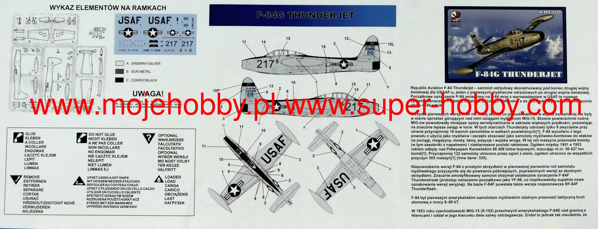 The Republic F-84 Thunderjet is an American single-seat, single-engine fighter-bomber. It was one of the first jet-powered fighters in the service of the US Air Force. The flight of the prototype took place in February 1946, and by 1953, 4,450 examples of this aircraft were built. Originally it was supposed to be called P-84, but it was eventually changed to F-84. The F-84E variant had a 12-inch longer fuselage in the pilot's cockpit to make flying more comfortable. The capacity of the fuel tank has also increased. The under-wing knots were also redesigned so that it was possible to carry additional fuel tanks instead of bombs. Far-reaching changes affected the F-84F Thunderstreak version, which received oblique wings, a new engine and served primarily as an attack aircraft. The "G" model has also undergone more in-depth changes. First of all, it received a new Allison J35-A-29 engine with a thrust of about 2650 kg, which increased its top speed to 1000 km / h and a range of 1600 km. The F-84G was also the first fighter capable of carrying nuclear weapons. F-84 aircraft were used on a large scale during the Korean War. In the first period of the conflict, they performed fighter functions, but as a result of the disastrous balance of air fights with the Mig 15s (8 victories against 64 lost planes), they quickly switched to the role of reconnaissance and attack aircraft. Technical data (F-84G version): Maximum speed: 1000 km / h, speed of climb: 19.1 m / s, maximum ceiling 12 350 m, maximum range: 1600 km, armament: fixed - 6 M2 Browning 12 machine guns, 7mm, sling - up to 2020kg of bombs and rockets, including the Mark VII nuclear bomb.