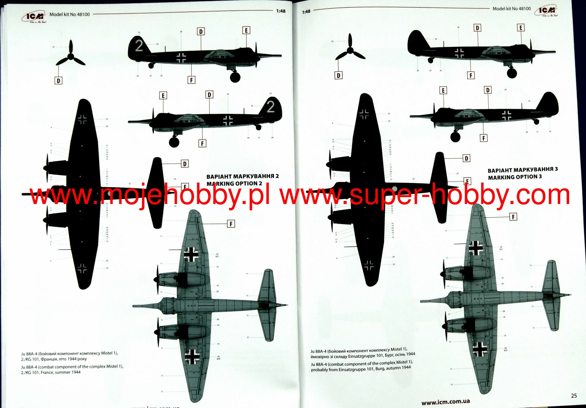Junkers Ju-88 is a German, twin-engine, multi-role aircraft in the spine-wing configuration, with a classic tail and all-metal structure. The flight of the prototype took place on December 21, 1936, and the entry into service took place in 1939. The first production series was powered by Jumo 211A engines. Thanks to good flight characteristics, considerable performance and a solid construction on the basis of the Ju-88, several different versions of the aircraft have been created, performing various functions. The first mass-produced version is the Ju-88A, with many revisions. It served as a medium bomber. Its three revisions have been adapted to desert operations (A9, A10, and A11). Ju-88B planes, which were used as reconnaissance aircraft, were produced on a small scale. On the other hand, the Ju-88C was produced on a large scale, with BMW 801 engines, which was a great night fighter. The Ju-88-C6c version featured the SN-2 radar and the Schrage Musik cannons. The D version is another reconnaissance version, but with new engines. Another development model is the famous Ju-88G, which is a night fighter with more and more modern aircraft radars (SN2, SN3, FuG-218, and finally the FuG-240 centimeter radar in the Ju-88G-7C version) and more powerful versions of engines. In addition, the following versions were created: Ju-88H, Ju-88p, Ju-88S and Ju-88T. The plane was used during the September Campaign, the War in Western Europe and the Battle of Britain in 1940, on a large scale on the Eastern Front and in battles with the Allied bombing raids over the German skies. About 15,000 copies of this successful aircraft were built, all versions. Technical data (Ju-88G): length: 15.5 m, wingspan: 20.08 m, height: 5.07 m, maximum speed: 550 km / h, maximum range: 2500 km, maximum ceiling 9900 m, armament: permanent-4 MG151 cannons / 20 20mm machine guns, 1-2 MG131 13mm machine guns and 1-2 MG151 / 20 20mm cannons in the Schrage Musik system.The Messerschmitt Bf-109 is a German metal-structure single-engine fighter in a low wing configuration with a classic tail. It turned out to be the basic and most produced Luftwaffe fighter during World War II. The flight of the prototype took place on May 29, 1935, and serial production continued in the years 1936-1945. In total, it is estimated that a total of about 35,000 Messerschmitt Bf-109 fighters of all varieties were produced, many of which ended up in the Czech and Israeli air forces after the war. The roots of the Bf-109 go back to the competition announced in 1933 by the Luftwaffe for a new fighter plane. In competition with the He-112, the Bf-109 project initially lost, but thanks to Willie Messerschmitt's intrigues, the project could continue and eventually he was the winner of the competition, becoming the Luftwaffe's primary fighter. Several main variants of the Bf-109 were developed in the course of production. The first pre-production series was the Bf-109B (Berta) with different versions of the Junkers Jumo 210 (A or Da) engine. They were tested in Spain from 1937 during the Civil War. The next version is the Bf-109C (Caesar). They had a different engine than the B version, and extensive armament consisting of two 20mm and 2 HP 7.92mm cannons. These machines also fought in the skies of Spain. The third version is the Bf-109D (Dora) with the Junkers Jumo 210 Da or Daimler-Benz DB 600 engine. It fought in the September campaign, but at the turn of 1939/1940 it was replaced by the E version. The most famous model was the Bf-109E (Emil) with a Daimler-Benz 601A or N engine. It was the first to use a three-blade, not a two-blade propeller. Bf-109E fought in the French campaign, over England, and in North Africa and on the Eastern Front. The ace who started his career on the Bf-109E was the famous Adolf Galland. The next version is the Bf-109F (Friedrich), which, according to the German pilots, was the most aerodynamically perfect. It sowed the changed shape of the fuselage, wings, cabin fairings, but no new engine was used. It was put into service at the turn of 1940/1941. As part of the development of the design, further Bf-109 specifications were developed, of which the G (Gustav) version was produced in the largest number of copies. The most important change increasing the machine's performance was the installation of a new 12-cylinder Daimler-Benz DB605A engine with 1475HP. The armament of the Bf-109G was a pair of 13mm machine guns located in the fuselage in front of the cockpit fairing, and the MG151 20mm or heavier MK108 30mm cannon. The last mass-produced version was the Bf-109K (Kurfirst), which production started in October 1944. A Daimler-Benz DB 605DB or DC unit was used as the engine. The Bf-109K was the fastest version produced during World War II, reaching up to 730 km / h. Apart from that, two versions were created - H and Z, but they were rather experimental versions and their mass production did not start. Subsequent improvements in propulsion and armament made the Messerschmitt Bf-109 one of the most dangerous fighters of World War II, and at the same time showed the great potential of the slightly angular airframe created by Willi Messerschmitt. Technical data (version Bf-109 G-6): length: 8.95 m, wingspan: 9.92 m, height: 2.6 m, maximum speed: 640 km / h, rate of climb: 17 m / s, maximum range: 850 km, maximum ceiling 12000m, armament: fixed - 2 MG131 13mm machine guns and 1 MG151 20mm cannon, suspended - 250 kg bombs, or 2 Wfr missile launchers. Gr. 21. instruction.pdf