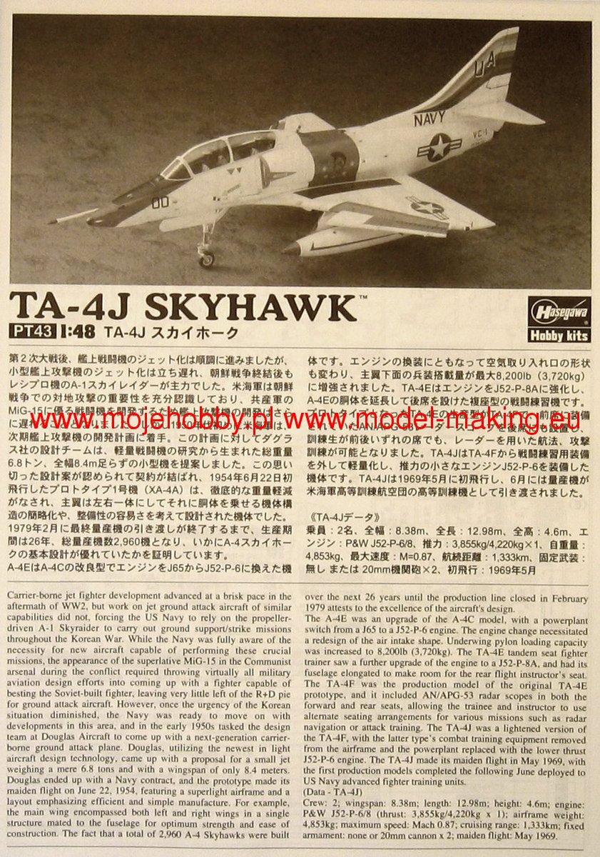 The McDonnell-Douglas A-4 Skyhawk is an American ground attack aircraft, the prototype of which was first flown in 1954. During the prototype trials in 1954, it broke the record for horizontal flight speed in its class of aircraft. The A-4 is a single-engine machine with a low-wing structure with a delta wing, which during use was characterized by high durability and resistance to damage, which won the recognition of pilots. Various versions of the A-4 Skyhawk aircraft took part in the Vietnam War, the Middle East conflicts (1967 and 1973) and the Falklands War (1982). They played a decisive role in the 1967 war, serving in the Israeli Air Force. The production ended in 1979, and so far approximately 2,900 combat versions and approximately 600 training versions have been produced. During the service, numerous versions were created, of which the A-4A (the first mass-produced version), A-4F (enhanced electronics), and A-4G (training version) should be replaced. Fixed armament: 2 Browning Mk 12 cannons (20 mm caliber); Suspended equipment (depending on the version) weighing from 3720 kg to 4155 kg. The plane exported, min. to Argentina, Australia, New Zealand and Singapore. Technical data: Top speed: 1075 km / h; climb speed 28-43m / s, practical ceiling 14900m, maximum range: 3305km.