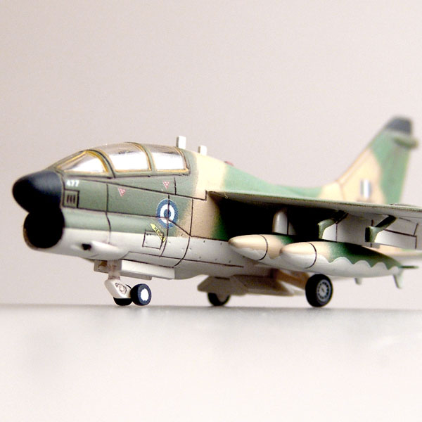 The Vought A-7 Corsair II is a light attack aircraft, adapted to be operated by aircraft carriers. Its history begins in February 1964, when Vought (today LTV Aerospace) was commissioned to develop the design of a new deck plane for the US Navy, intended to replace the A-4 Skyhawk, with greater payload and range. The project was developed on the basis of the F-8 Crusader, adapting it to subsonic flights. The flight of the A-7 prototype was made in 1965, and serial production started a year later. The Corsair II resembles the Crusader silhouette, but the wing wedge angle was not changed, which was redesigned, increasing the number of suspension knots to 6, and - apart from flaps and ailerons - saws and spoilers, a device for hydraulic wing folding was also introduced. The structure was largely unified with the Crusader, using many ready-made elements. The main versions are: A-7E (fighter assault), A-7H (land version), A-7K (new avionics, in service since 1980). The A-7 Corsair II aircraft were used in combat on a large scale in the Vietnam War and in the air attack on Libya in 1986. They were also exported, min. to Greece and Portugal. Technical data: Top speed: 1100 km / h; climb speed 67 m / s, maximum ceiling 16000 m, maximum range: 4600 km, fixed armament: 2 20mm Mk.12 cannons, lifting capacity: up to 6800 kg.