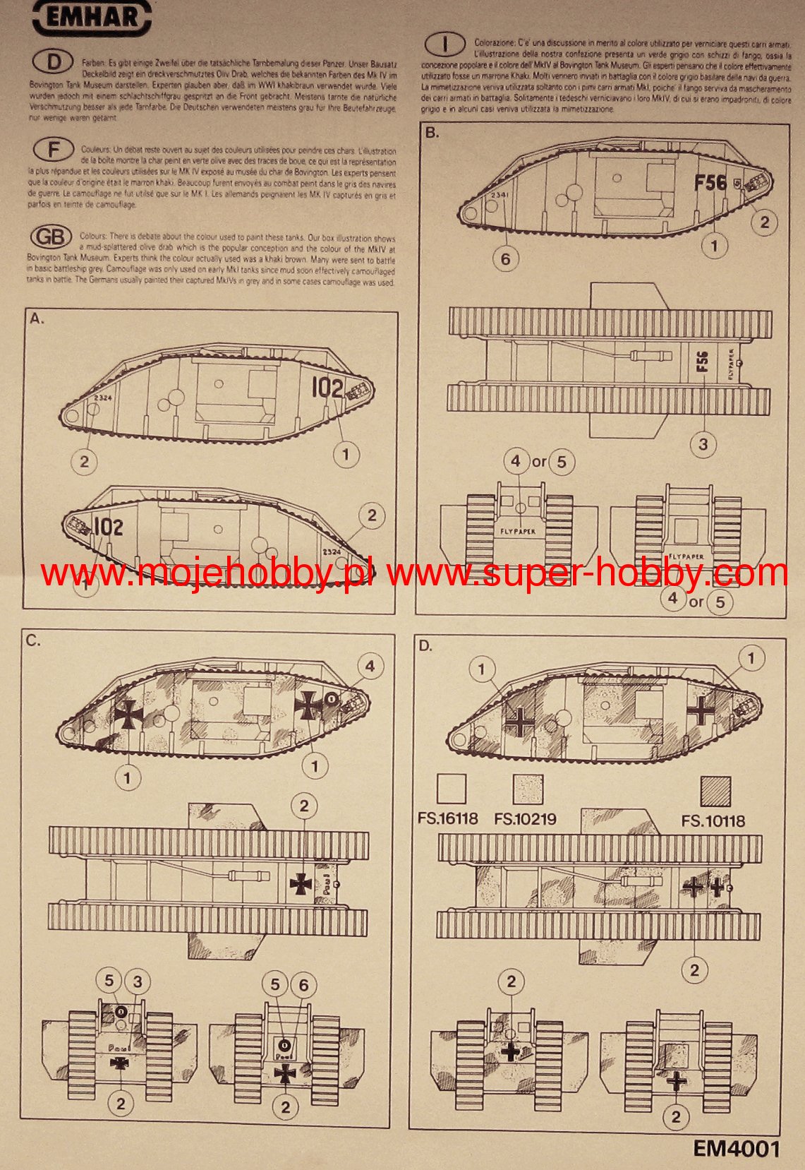 The Mark I tank is a British tank, often classified as a WW1 heavy tank. The first prototypes of this car appeared in 1916, and serial production started in the same year. The car was powered by a single carburettor engine with a capacity of up to 105 HP. The length of the vehicle was 7.93 meters with a total width of 4.19 meters. The armament of the vehicle (in the so-called Male version) consisted of two 57 mm cannons and three machine guns, while the so-called female version - five machine guns. The Mark I tank was the first British tank of the Great War to be used extensively and the first tank used in combat in history! It was developed on the basis of the assumptions and conclusions drawn from the operation of the prototype Little Willie tank. At the same time, however, it clearly differed from it in the location of the tracks or the shape of the hull, although it was powered by the same engine. The Mark I tank also introduced a rhomboidal shape typical of British tanks of 1916-1918. The vehicle did not have a turret, and all the armament was mounted on sponsons on the sides of the tank. The Mark I was first used in combat in September 1916 at the Battle of the Somme.The Mark V tank is a British tank, often classified as a WW1 heavy tank. The first prototypes of this car appeared at the end of 1917, and serial production started at the turn of 1917-1918. As a result, about 400 tanks of this type were created. The car was powered by a single Ricard engine with a capacity of up to 150 HP, and its weight reached 30 tons. The armament of the vehicle (in the so-called Male version) consisted of two 57 mm cannons and three machine guns, while the so-called female version - five machine guns. The so-called Composite (or Hermaphrodites) version armed with a single 57mm cannon and four machine guns. The Mark V was developed on the basis of the Mark IV tank. From its predecessor, it took over the main design assumptions, such as the diamond shape of the hull and tracks, the lack of a turret with armament and its placement in sponsons on the sides of the wagon. However, it received a new drive unit and, what is equally important, a different drive train and a track turning mechanism. There was also an observation tower for the commander of the car. The tank was also much more mechanically refined than its predecessor, and its armor thickness varied from 6 to 14 millimeters. Mark V tanks were used in combat for the first time at the Battle of Hamel in July 1918. They were also used extensively at the Battle of Amiens in August 1918. Interestingly, they were definitely withdrawn from the British Army only in the early 1930s!The Mark II tank is a British tank, often classified as a WW1 heavy tank. The first prototypes of this car appeared in 1916, and serial production continued at the turn of 1916-1917. As a result, 50 tanks of this type were created. The car was powered by a single carburetor engine with the power of 105 HP, and its weight ranged from 27 to 28 tons. The armament of the vehicle (in the so-called Male version) consisted of two 57 mm cannons and three 8 mm Hotchkiss machine guns, while the so-called Female version - five machine guns, including one 8mm Hotchkiss and four 7.7mm Vickers. The Mark II was developed on the basis of the Mark I tank. From its predecessor, it adopted the main design assumptions, such as the diamond shape of the hull and tracks, the lack of a turret with armament and its placement in sponsons on the sides of the vehicle. At the same time, from the very beginning, it was assumed that the Mark II would be primarily intended for training tasks, as well as introducing numerous, though rather minor, mechanical improvements resulting from the use of Mark I vehicles. The training courses were used in the Battle of Arras in April and May 1917, but suffered heavy losses.The Mark IV tank is a British tank, often classified as a WW1 heavy tank. The first prototypes of this car appeared in 1917, and serial production continued in 1917-1918. As a result, about 1,220 tanks of this type were created. The car was powered by a single Daimler-Foster engine up to 105 HP, and its weight ranged from 27 to 29 tons. The armament of the vehicle (in the so-called Male version) consisted of two 57 mm caliber cannons and three 7.7 mm Lewis machine guns, while the so-called the female version - five 7.7 mm Lewis machine guns. The Mark IV was developed on the basis of the Mark I tank. From its predecessor, it adopted the main design assumptions, such as the diamond shape of the hull and tracks, the lack of a turret with armament and its placement in sponsons on the sides of the vehicle. The main modernization concerned a significant reinforcement of the armor and the placement of the fuel tank in a different part of the vehicle. The car was also generally more mechanically efficient and less reliable than its predecessor. Some vehicles of this type were also equipped with radio stations and mortars. It is also worth adding that the production of Mark IV tanks was several times greater than that of Mark I vehicles, which meant that it was divided between six production plants, with the main producer being the Metropolitan plant. Mark IV tanks were used in combat for the first time during the Battle of Messines in the summer of 1917.