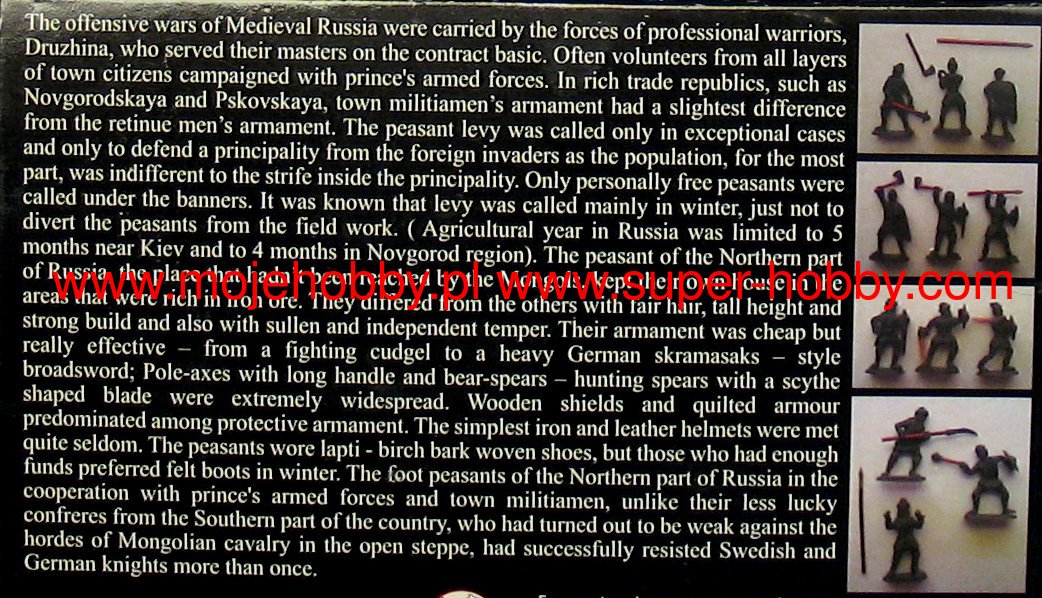 The military character of medieval Ruthenia was determined by the vast areas of Russian lands, as well as by the various types of enemies with which the troops of the Ruthenian princes had to contend. Of course, these warriors often fought on foot. In the 9th-10th centuries, as a result of very strong Wareska (Norman) influences, Russian foot warriors were relatively well armed - they had a sword, an iron helmet, a round shield, often put on chain mail, and in the eastern Ruthenian lands also lamellar armor. Of course, spears and javelins were also used. Of course, there were very large differences in armament between the rushed prince's party and the peasants called up for the expedition. At the time of interaction with the steppe peoples (mainly the Pechenegs), and later especially the Mongols (from the 13th century), among the Russian foot troops, a significant role was attached to the missile weapons - especially the bow. It is also worth adding that the Ruthenian armies were relatively numerous in the Middle Ages and to a large extent consisted of infantry. For example, in the Battle of Lake Peipus (1241), the Ruthenian army might have numbered around 15,000. people, and in the battle in Kulikowe Pole (1380), perhaps approx. 30 thousand. people.