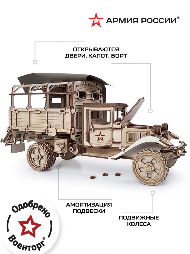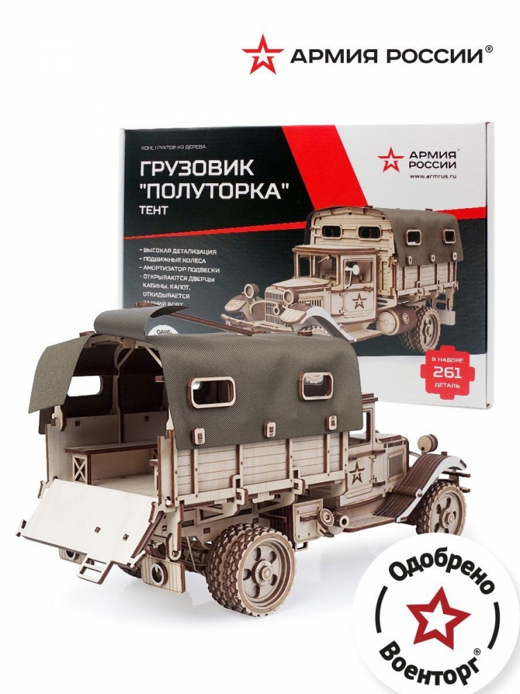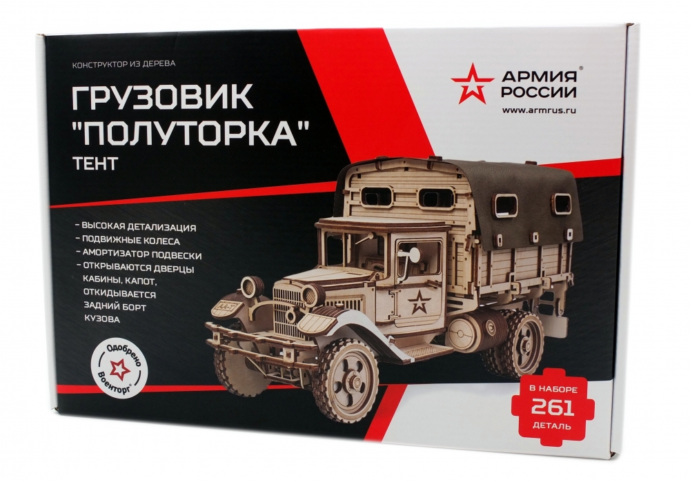 Описание Грузовик с тентом собирается с минимальным использованием клея. Собранная модель имеет большой масштаб и крутой нрав. Открывается все, что может открываться. Может ехать и имеет амортизацию переднего моста. Тент входит в набор. У модели вращаются колеса, открываются дверцы кабины, капот, откидывается задний борт кузова. Подвеска с амортизацией. Возраст: от 5 лет Количество деталей: 261 шт. Размеры: 330х125х160 мм В набор входит: Наждачная бумага. Клей ПВА. Подробная инструкция Плашки с деталями Материал для тента