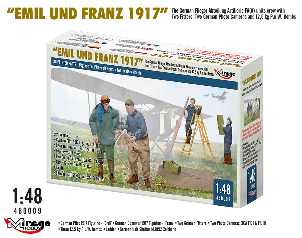 Download Mirage Hobby PDF catalogueThe German air force was organized in 1913 under the name of die Fliegertruppen des deutschen Kaiserreiches, to change its name to in 1916 Luftstreitkräfte. At the time of the outbreak of World War I, they played a decisively subordinate role to the ground forces and were, moreover, quite strictly subordinated to them. It is worth adding that each German infantry division included a reconnaissance company of 6 aircraft in August 1914. However, very quickly the German air force began to expand and play an increasingly important role over the battlefield. In 1918, they had a total of about 2,700 aircraft and about 240 other aircraft. This significant quantitative development was possible, among others, thanks to a strong industrial base and a well-developed aviation industry with such factories as: Albatros Flugzeugwerke, Fokker, Pfalz Flugzeugwerke or Siemens-Schukert. The German air force also introduced many successful aircraft in the years 1914-1918, including the great Fokker Dr.I or Gotha G.IV or GV fighter, but also such unusual designs as the Zeppelin-Staaken R.VI. The German air force was also able to undergo organizational changes during the Great War, as evidenced by the establishment of specialized fighter units (German: Jagdstaffeln) in 1916. Manfred von Richthofen, known as the red baron, was undoubtedly one of the greatest Luftstreitkräfte aces, but it is also worth remembering about such pilots as: Max Immelmann, Wilhelm Frank, Oswald Boelcke, Ernst Udet or later Luftwaffe commander Herman Göring.