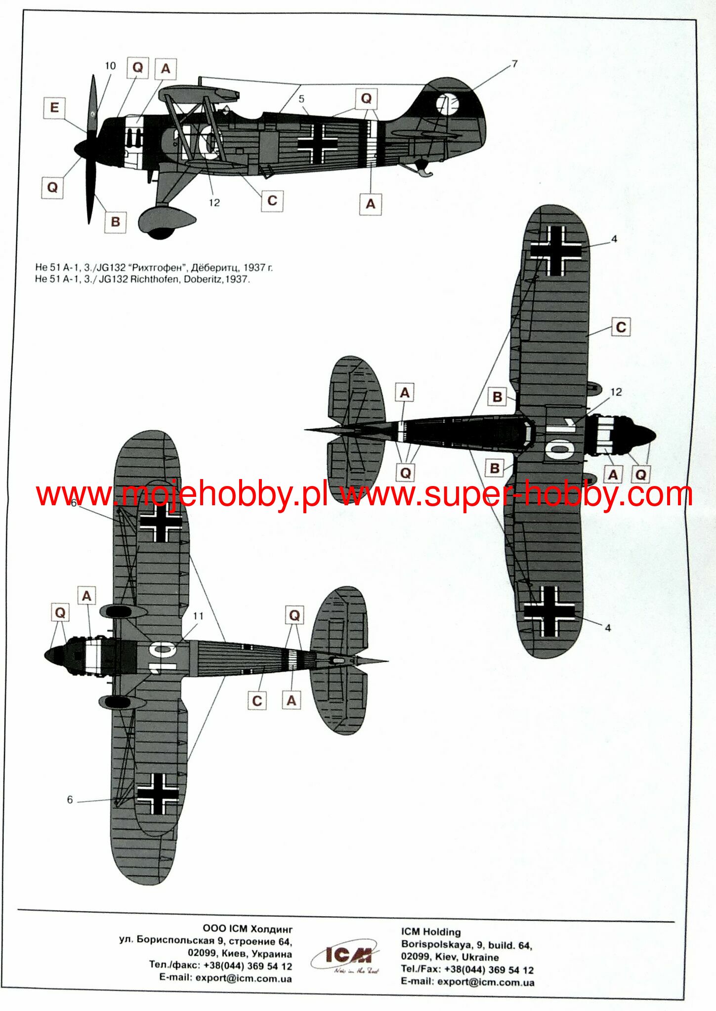 The Polikarpov Po-2 ("Kukurusnik") is a mixed Soviet multipurpose biplane with a classic tail and a fixed landing gear. The flight of the prototype took place in 1928, and serial production lasted from 1928 until 1959! It was originally intended to be the USSR's primary aviation training aircraft. Already the first prototype and serial units showed the advantages of the structure - very simple production technology, low unit cost, considerable structural strength, simple operation, short take-off and landing distance. Due to these features, the Po-2 was in service until the 1970s, with at least a dozen versions. The basic production version is the Polikarpov U-2 with the Szwecow M-11 engine with a capacity of 100 HP, and later up to 150 HP. It was produced in a large number of variants, both for the military and for civilian use (e.g. for spraying farmland). Another version is the U-2SSz, a classic liaison plane. The U-2LSz model, i.e. an attack plane armed with a 7.62 caliber machine gun, bombs (up to 240 kg) and rockets, was very popular. Another variation is the U-2LNB - a light night bomber. The Po-2, despite its backwardness in design, was intensively used by the USSR air forces during World War II. The Po-2 performed multiple missions - as a liaison plane, supporting partisans, reconnaissance, light night bomber. It was on these machines that the famous 588th Night Bomber Regiment flew, the entire staff of which was made up of women, called by the Germans "Night Witches". Po-2 was also used in Polish aviation until 1950. It also served in the Korean War, where, paradoxically, it was difficult to destroy during night actions by American fighters. There were two reasons for this: the low maximum speed of Po-2, which made it difficult to aim, and the canvas cover, which made it very difficult to track radar. Technical data (U-2 version): length: 8.17m, wingspan: 11.4m, height: 3.1m, maximum speed: 152km / h, climb speed: 2.2m / s, practical ceiling: 3000m, range maximum: 630 km, weapons: fixed - 1 SzKAS 7.62 mm machine gun, suspended - up to 240 kg of bombs.The Kawasaki Ki-10 is a Japanese metal-structure single-seat biplane fighter with a solid-classic landing gear from the initial period of the Japanese-Chinese war. It is considered the best Japanese biplane fighter of the 1920s and 1930s. The Ki-10 was a return to the biplane after unsuccessful attempts with the Ki-5 low wing of 1934. The ki-10 biplane was designed by Takeo Doi with the assistance of Isamu Imachi. In March 1935, the first prototype was built, in September the plane was put into mass production as a Type 95 fighter. However, because the military demanded better maneuverability of the plane, in parallel with production, from December 1935, work was carried out on the Ki-10-II variant, which entered mass production after being built in October 1937, 300 aircraft. By the end of production in December 1938, 280 Ki-10-II aircraft were built. The producer was Kawasaki plants. The Ki-10 in both variants was a fighter unit of the Japanese army until 1940. However, it was inferior to enemy planes. Japanese aviation suffered as much as 38% of its losses in air combat. During this period, the USSR provided China with min. 400 modern aircraft and over 200 Soviet airmen died during the fighting on the Chinese side. Four prototypes were used in the Type 95 Fighter's upgrade program. They flew with different engines, changed wings, and a closed pilot's cockpit. They achieved a speed of 425 km / h, then even 445 km / h, but that was the end of their development, as they returned to the monoplane system. Technical data: length: 7.2 m, wingspan: 10.02 m, height: 3 m, maximum speed: 400 km / h, maximum range: 1100 km, maximum ceiling 10000 m, armament: fixed - 2 machine guns type 89, caliber 7.7 mm .The Heinkel He-51 is a German single-engine biplane fighter, training light stormtrooper and mixed seaplane. The prototype's flight took place in 1933, and the machine entered service in 1935. The He-51 was used in combat during the Spanish Civil War (1936-1939). In the course of the conflict, it turned out to be a machine much worse than the Soviet I-15 and I-16, it was also over 100 km / h slower than SB bombers. From 1938, planes were withdrawn from line units and transferred to aviation schools. He 51 seaplane was built in 1934. The modified landing gear had floats instead of wheels. Just like the fighter version, the seaplanes were sent back to training units before the outbreak of the war. In total, about 700 aircraft of this type were built, most of them in the "B" version. Technical data: length: 8.4m, wingspan: 11m, height: 3.2m, maximum speed: 330km / h, rate of climb: 11.9m / s, maximum range: 570km, maximum ceiling 7,700m, armament: fixed-2 7.92mm MG17 machine guns, suspended - up to 60 kg of bombs instruction1.pdfinstruction2.pdfinstruction3.pdf