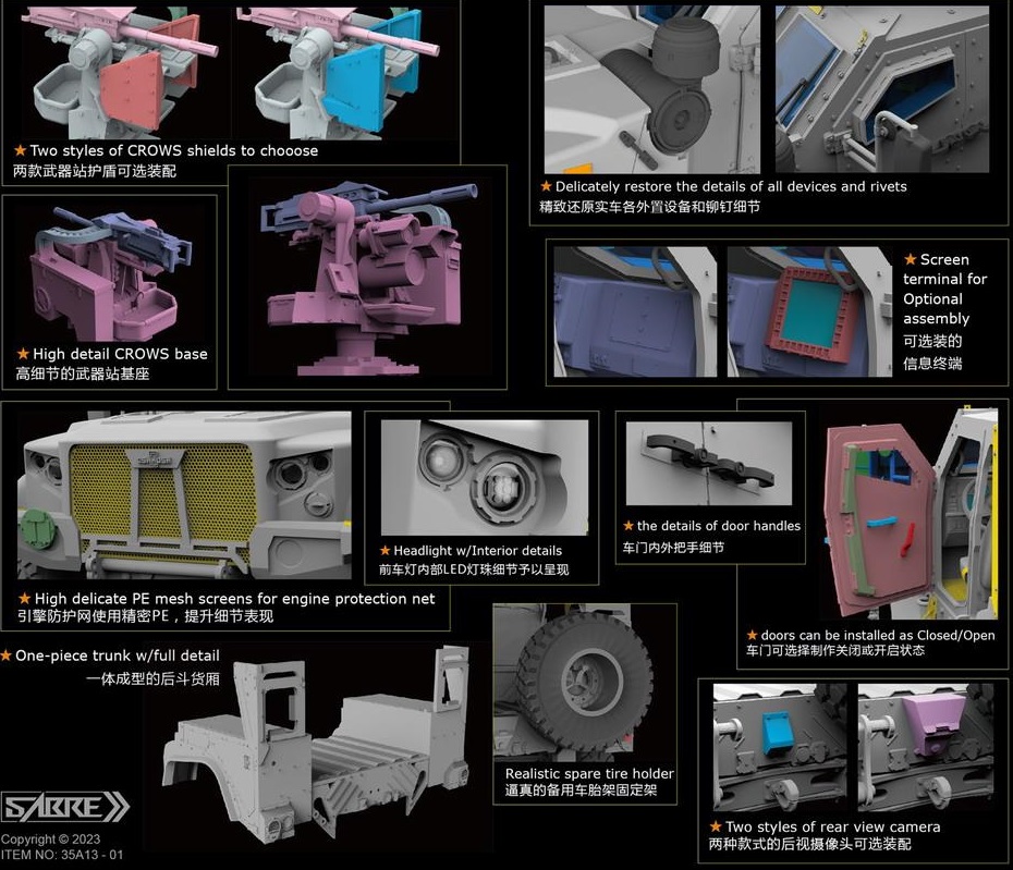 Описание Пластиковый комплект для JLTV M1278A1 с M153 Crows и гранатометом Mk19 ПРЕМИАЛЬНОЕ ИЗДАНИЕ - Масштаб 1:35 - Двери могут быть выполнены открытыми или закрытыми - Высокодетализированные детали с фототравлением для решетки радиатора и вентиляции двигателя - Гранатомет со множеством деталей - Передние фары с внутренними деталями из светодиодов - цельный багажник с полной детализацией - Полностью детализированные диски - подробные хвостовые соединения - Возможна блокировка рулевого управления для передних колес - реалистичный держатель запасного колеса - Стандартные аксессуары: 1x водные декали 1x базовые детали с фототравлением 1x маски для рисования Бонусные дополнения: 1. Металлический медный ствол (1 шт.), опора ствола из 3D-печати (1 шт.); 2. Антенны Duke IED из 3D-печати (1 шт.), металлическая антенна (1 шт.), 3D-печатная база A (1 шт.), B (1 шт.); 3. Металлическая медная антенна (2 шт.), основание из 3D-печати (2 шт.), основание антенн Duke IED из 3D-печати (1 шт.); 4. Наборы бутылок для напитков: 11 видов бутылок для напитков, всего 47 штук, декаль (1 шт.), упаковочная коробка (1 шт.); 5. Зеркальная наклейка (включает O-GPK); 6. Комплекты лебедочного оборудования: Лебедка (1 шт.), фототравлёная защитная сетка (1 шт.); 7. Деревянный поддон (1 шт.); 8. Металлическая выхлопная труба (1 шт.); 9. Фототравлёные ремни безопасности (1 шт.), фототравлёные детали (1 шт.).