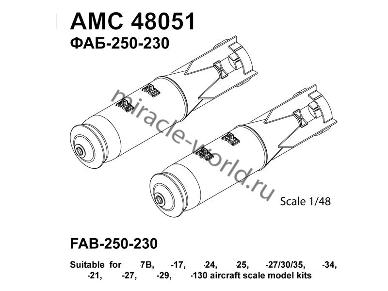 AM AMC 48051 ФАБ-250-230 (4ШТ.) /ФУГАСНАЯ АВИАБОМБА КАЛИБРА 250КГ./ 1/48 (1/48) продается в 2 магазинах. Выберите подходящий Вам интернет-магазин и перейдите по ссылке «В магазин».