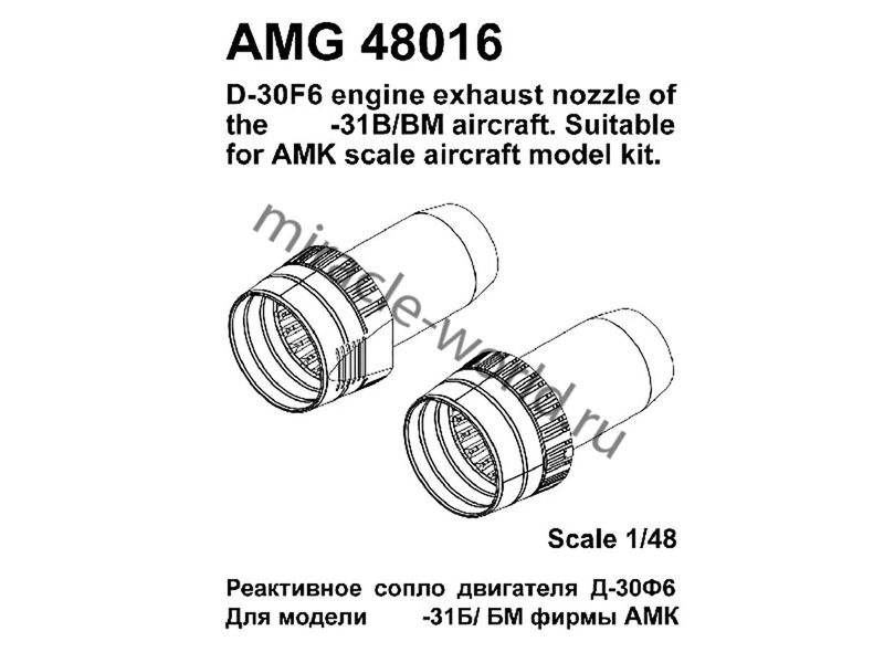 AMIGO AMG 48016 РЕАКТИВНОЕ СОПЛО ДВИГАТЕЛЯ Д-30Ф6 (2ШТ.) ДЛЯ САМОЛЕТ (М) ТИП 31Б/31БМ 1/48 (1/48) продается в 2 магазинах. Выберите подходящий Вам интернет-магазин и перейдите по ссылке «В магазин».