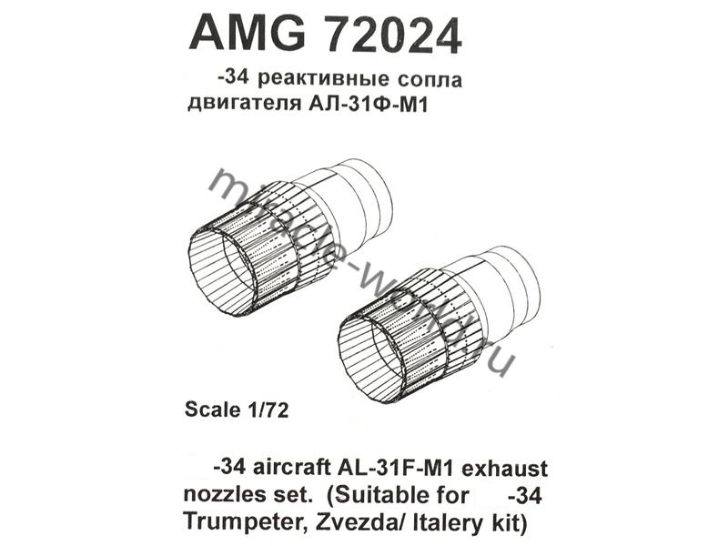 AMIGO AMG 72024 РЕАКТИВНОЕ СОПЛО ДВИГАТЕЛЯ АЛ-31Ф (2ШТ.) ДЛЯ САМОЛЕТ (С) ТИП 34 1/72 (1/72) продается в 1 магазинах. Выберите подходящий Вам интернет-магазин и перейдите по ссылке «В магазин».