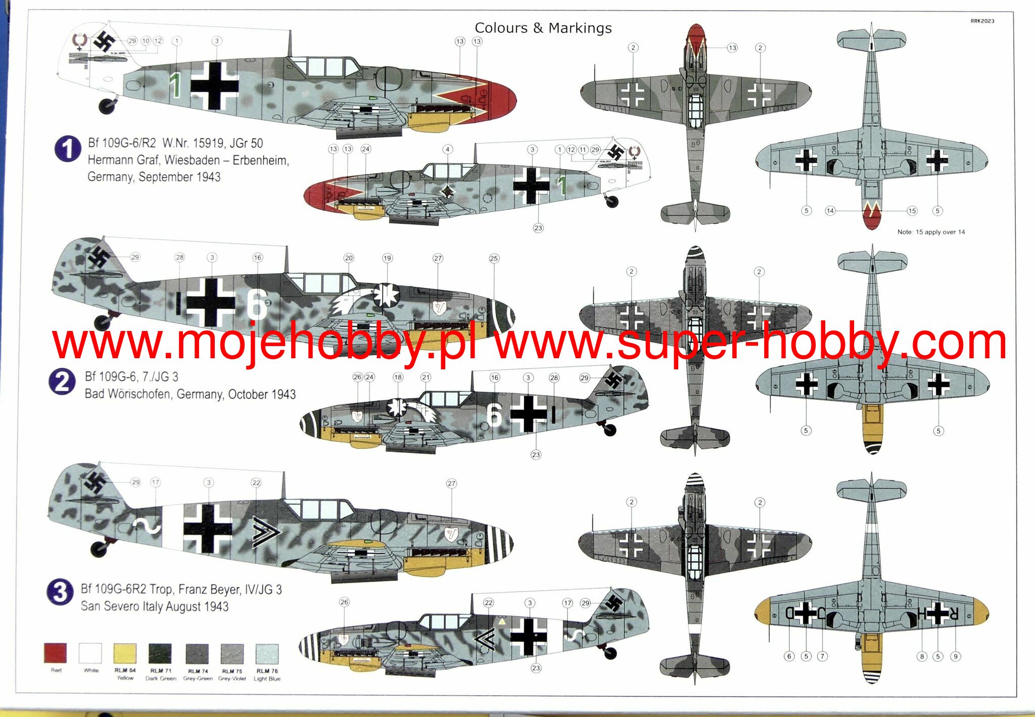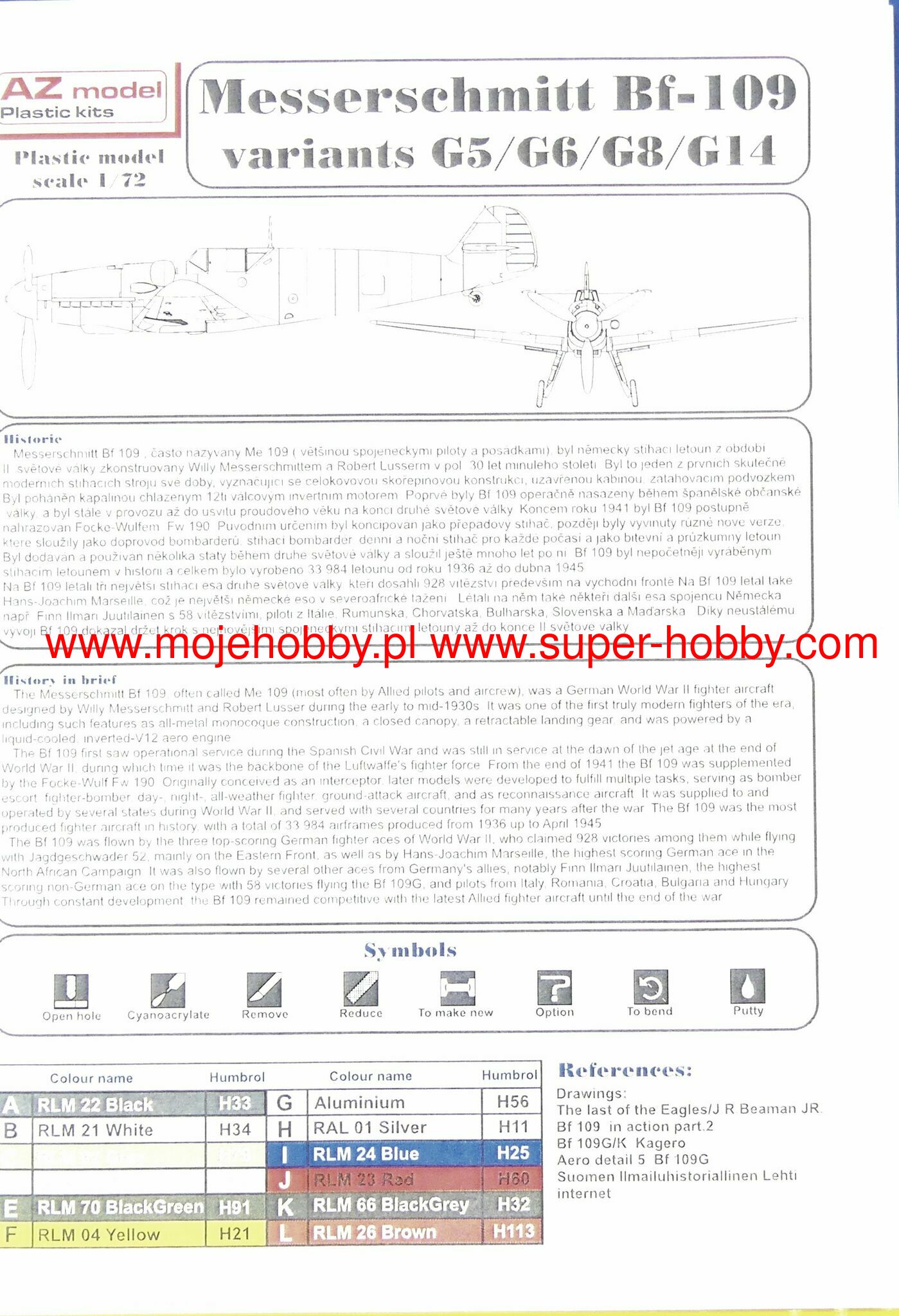 The Messerschmitt Bf-109 is a German metal-structure single-engine fighter in a low wing configuration with a classic tail. It turned out to be the basic and most produced Luftwaffe fighter during World War II. The flight of the prototype took place on May 29, 1935, and serial production continued in the years 1936-1945. In total, it is estimated that a total of about 35,000 Messerschmitt Bf-109 fighters of all varieties were produced, many of which ended up in the Czech and Israeli air forces after the war. The roots of the Bf-109 go back to the competition announced in 1933 by the Luftwaffe for a new fighter plane. In competition with the He-112, the Bf-109 project initially lost, but thanks to Willie Messerschmitt's intrigues, the project could continue and eventually he was the winner of the competition, becoming the Luftwaffe's primary fighter. Several main variants of the Bf-109 were developed in the course of production. The first pre-production series was the Bf-109B (Berta) with different versions of the Junkers Jumo 210 (A or Da) engine. They were tested in Spain from 1937 during the Civil War. The next version is the Bf-109C (Caesar). They had a different engine than the B version, and extensive armament consisting of two 20mm and 2 HP 7.92mm cannons. These machines also fought in the skies of Spain. The third version is the Bf-109D (Dora) with the Junkers Jumo 210 Da or Daimler-Benz DB 600 engine. It fought in the September campaign, but at the turn of 1939/1940 it was replaced by the E version. The most famous model was the Bf-109E (Emil) with a Daimler-Benz 601A or N engine. It was the first to use a three-blade, not a two-blade propeller. Bf-109E fought in the French campaign, over England, and in North Africa and on the Eastern Front. The ace who started his career on the Bf-109E was the famous Adolf Galland. The next version is the Bf-109F (Friedrich), which, according to the German pilots, was the most aerodynamically perfect. It sowed the changed shape of the fuselage, wings, cabin fairings, but no new engine was used. It was put into service at the turn of 1940/1941. As part of the development of the design, further Bf-109 specifications were developed, of which the G (Gustav) version was produced in the largest number of copies. The most important change increasing the machine's performance was the installation of a new 12-cylinder Daimler-Benz DB605A engine with 1475HP. The armament of the Bf-109G was a pair of 13mm machine guns located in the fuselage in front of the cockpit fairing, and the MG151 20mm or heavier MK108 30mm cannon. The last mass-produced version was the Bf-109K (Kurfirst), which production started in October 1944. A Daimler-Benz DB 605DB or DC unit was used as the engine. The Bf-109K was the fastest version produced during World War II, reaching up to 730 km / h. Apart from that, two versions were created - H and Z, but they were rather experimental versions and their mass production did not start. Subsequent improvements in propulsion and armament made the Messerschmitt Bf-109 one of the most dangerous fighters of World War II, and at the same time showed the great potential of the slightly angular airframe created by Willi Messerschmitt. Technical data (version Bf-109 G-6): length: 8.95 m, wingspan: 9.92 m, height: 2.6 m, maximum speed: 640 km / h, rate of climb: 17 m / s, maximum range: 850 km, maximum ceiling 12000m, armament: fixed - 2 MG131 13mm machine guns and 1 MG151 20mm cannon, suspended - 250 kg bombs, or 2 Wfr missile launchers. Gr. 21.