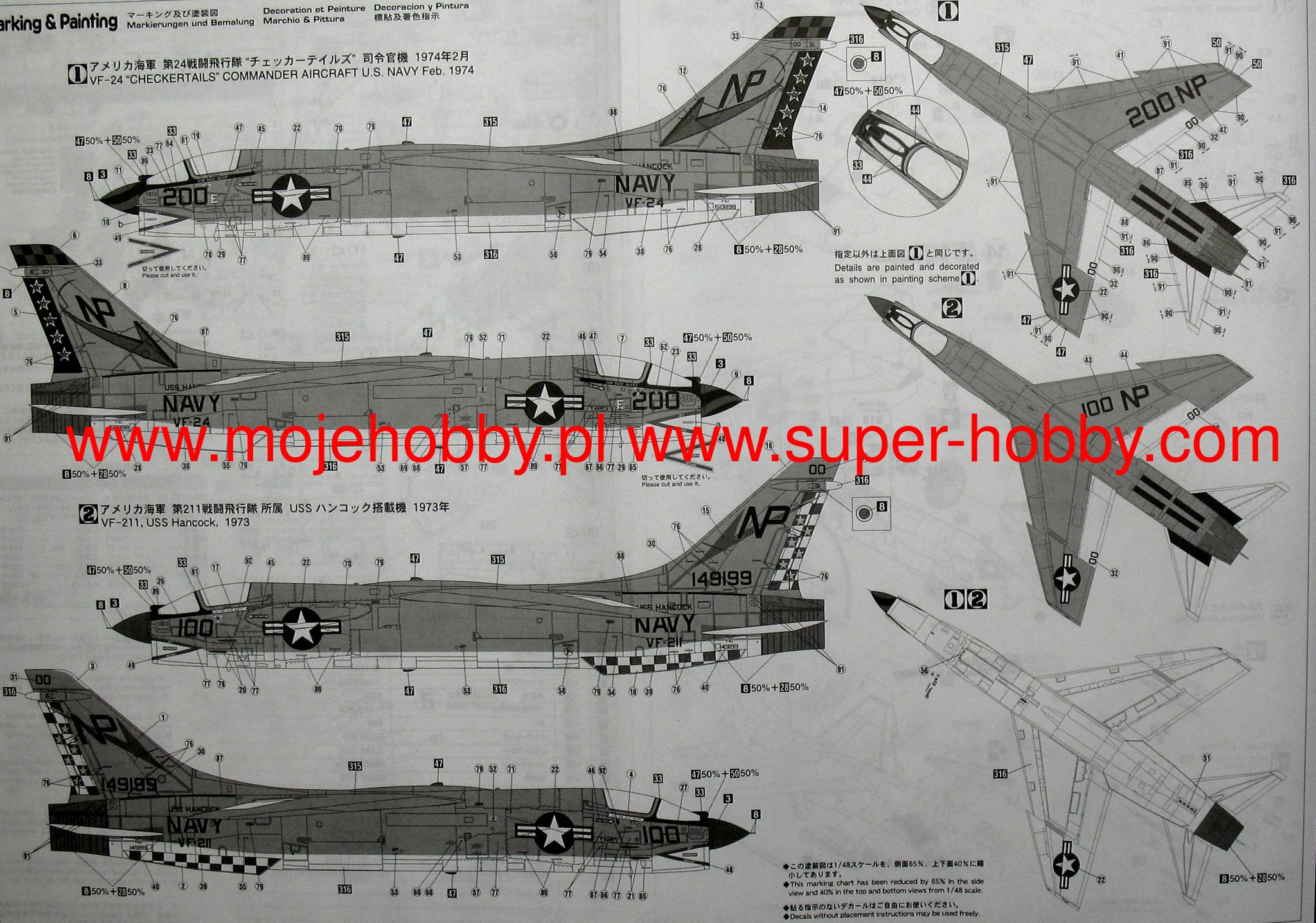 The Vought F-8 Crusader was an American in-flight fighter and attacker from the post-war period. The drive, in the F-8E version, was provided by a single engine Pratt and Whitney J57-P-20A with 47.6 kN thrust without afterburner. The first flight of this machine took place in 1955. Its serial production started shortly after. In total, over 1,200 machines of this type were built. The length of the aircraft was 16.53 meters with a wingspan of 10.87 meters. In the F-8E version, the on-board armament consisted of four 20mm Colt Mk.12 cannons. The machine could also take a load of bombs, unguided and guided missiles. The Vought F-8 Crusader was developed for the US Navy as a successor to the completely unsuccessful Vought F-7U-1 Cutlass. It was characterized by a much more conservative design, but it was also much easier to pilot, operate and operate. Equally important, it also turned out to be significantly less failure-prone than its predecessor. It also had a much better maximum speed (the first serial supersonic deck fighter!), Maneuverability and good take-off and landing characteristics from the deck of an aircraft carrier. In general, a very successful plane was created, which remained in service with the US Navy as a fighter until 1976, and in the French naval aviation - until 1999! In the course of serial production, many versions of this aircraft were created, including: F-8U-1 (first production version), F-8U-2N (night fighter) and F-8E (FN)[wersja dla marynarki francuskiej] . Vought F-8 Crusader aircraft took an active part in several armed conflicts, but were used particularly intensively during the Vietnam War of 1964 / 1965-1975.
