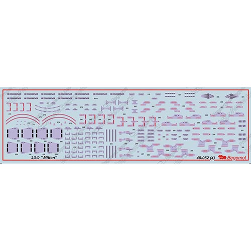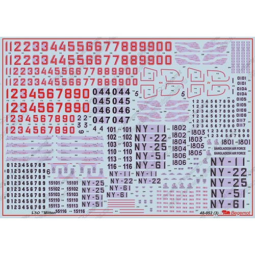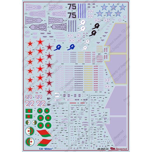 Декаль от российской компании-производителя "Бегемот". Декаль на все известные на сейчас самолеты Я-130 1/48 из состава ВВС России, Беларуссии, Алжира, Мьянмы, Лаоса и Бангладеш. Полный комплект технических надписей на самолет и подвесное вооружение В комплект входит три листа декали большого размера и один лист декали маленького размера и инструкция на 10-х страницах формата А3. (Begemot 48-052)