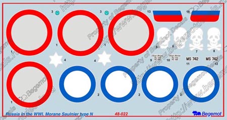 Декаль от российской компании-производителя "Бегемот". Россия в I мировой войне. Моран Солнье тип Н. 1/48. Декаль, содержащая четыре варианта маркировки самолета "Моран Солнье тип Н" из состава 1-ой Боевой Авиационной Группы авиации Российской империи, известной "адамовыми головами" на килях. В комплект входит один лист декали среднего размера и полноцветная инструкция на 2-х страницах формата А4. (Begemot 48-022)