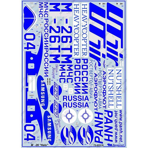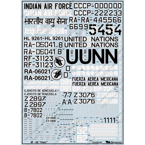 Декаль от российской компании-производителя "Бегемот". М&-26 1/72. Декаль на различные варианты маркировки М&-26Т, включая полный комплект технических надписей, в том числе и для интерьера грузовой кабины. (Begemot 72-031)