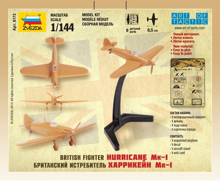 Сборная модель - Британский истребитель Харрикейн Мк-1. Историческая справка: Модель легендарного самолета Второй Мировой войны Харрикейн. Модель займет достойное место как на полке коллекционера, так и послужит основой британских ВВС игроков системы Art-of-Tactic. Историческая справка: Харрикейн был стал выпускаться с 1934 года и долгое время был основным истребителем британских ВВС. К началу битвы за Британию, не только Харрикейн, но и более современный Спитфайр, уступали немецким Мессершмиттам, однако, мужество и героизм британских лётчиков смогли переломить ход битвы в свою пользу. Именно эти машины не позволили уничтожить Лондон с воздуха. Харрикейн поставлялся и в СССР, но, в момент поступления, зимой 1941 года, он уже безнадёжно уступал не только немецким, но и советским истребителям. Использование танка в Art of Tactic: В игре самолёт отлично справляется с разведкой местности, патрулированием и прикрытием собственных бомбардировщиков. Набор деталей из пластмассы для сборки одной модели самолета. Краски продаются отдельно от набора. Состав набора: 1 неокрашенный самолет 1 подставка 1 декаль Карточку с игровыми характеристиками отряда вы найдете на этой странице в разделе "СХЕМА СБОРКИ И ОКРАСКИ"