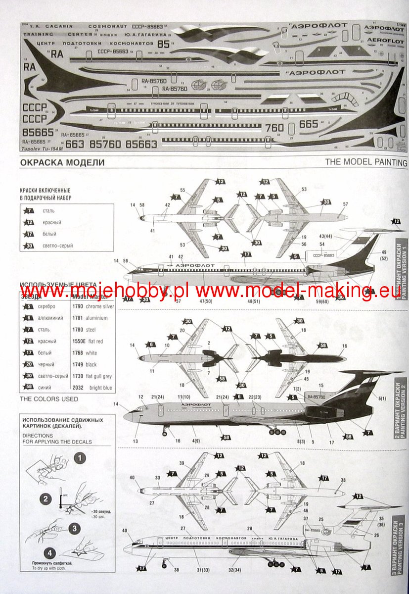 Сборная модель - Российский авиалайнер ТУ-154М. Историческая справка: Среднемагистральный пассажирский самолет Ту- 154М, разработанный в КБ им. А.Н. Туполева, выпускался серийно с 1984 года. Этот лайнер является одним из самых массовых российских пассажирских самолетов. Ту-154М способен перевозить до 158 пассажиров на расстояние до 3 500 км со скоростью 950 км/ч. Ту-154М является одним из немногих отечественных пассажирских самолетов, поставляемых на экспорт. В десятках ведущих авиакомпаний России и зарубежья ежедневно эксплуатируются сотни самолетов Ту-154М. Набор деталей из пластмассы для сборки одной модели самолета. Модель собирается при помощи специального клея, выпускаемого предприятием Звезда. Краски продаются отдельно от набора. Состав набора: отливки инструкция по сборке декаль