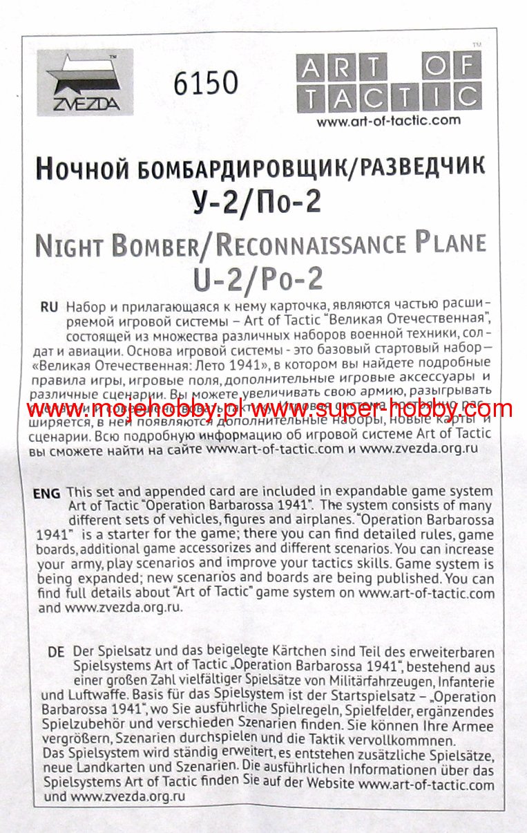 Сборная модель - Советский ночной бомбардировщик/разведчик По-2. Историческая справка: Самолёт был создан в 1928 году в КБ Николая Поликарпова. Изначально самолёт носил название У-2, т.е. учебный -2, так как по техническому заданию, разрабатывался для обучения состава лётных школ. Лёгкий, манёвренный и надёжный биплан сразу же полюбился молодым лётчикам. Отличное управление и жизнестойкость конструкции дополнялись дешёвизной производства. Все будущие советские асы начинали свой лётный путь на У-2.Самолёт выпускался в разных модификациях, включая санитарный, верой и правдой служил в сельском хозяйстве. С началом Великой Отечественной войны У-2 массово переделывают в лёгкий ночной бомбардировщик. Простота конструкции позволяла производить данную операцию в полевых условиях. Самолёт получил бомбовую нагрузку в 250кг., а также задний пулемёт ШКАС. В 1944 году, после смерти Николая Поликарпова, самолёт был переименован в По-2. Тактика лёгких бомбардировщиков была следующая: машины подходили к линии фронта на малом газе, после чего выключали двигатели и проводили бомбардировку объектов. Маленький и юркий По-2 был незаметен для вражеских ПВО. А из-за того, что летали лётчики на малых высотах, то и ночные истребители противника были малоэффективными. Особо прославился По-2, как бомбардировщик, на котором летали женщины. 46 гвардейский Таманский был укомплектован только женщинами лётчицами.23 лётчицы были награждены высоким званием Герой Советского Союза. Труженец По-2 прошёл всю войну, громил вражеские войска, вывозил раненых, снабжал по воздуху партизанские отряды и окружённые войска, надёжно служил в разведке. Он заслуженно стоит в одном ряду с танком Т-34, штурмовиком Ил-2 и гвардейским реактивным миномётом БМ-13 Катюша. Использование самолета в Art of Tactic: В игре По-2 является самым дешёвым советским бомбардировщиком. Предназначен для уничтожения живой силы и лёгкой бронетехники противника. Способен вести разведку. Из минусов стоит отметить лёгкое бронировании, что делает его уязвимым как к атакам истребителей, так и к огню зенитных орудий. Набор деталей из пластмассы для сборки одной модели самолета. Краски продаются отдельно от набора. Состав набора: 1 неокрашенный самолет 1 подставка 1 декаль