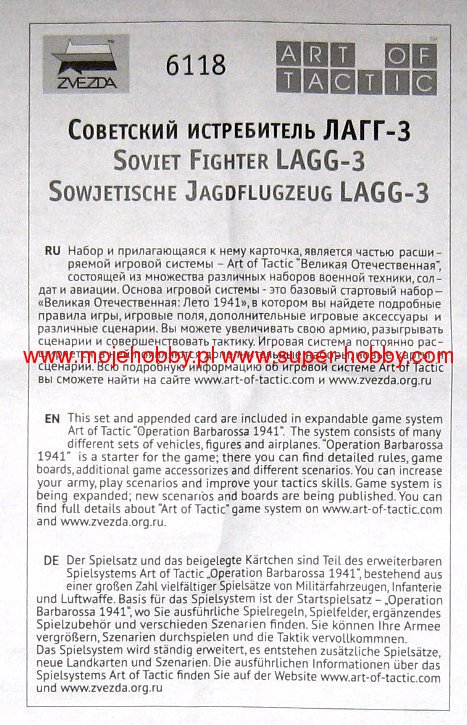 Сборная модель - Советский истребитель ЛаГГ-3. Историческая справка: Самолёт разработан конструкторами Лавочкиным, Горбуновым и Гудковым. Был самым лучшим по вооружению в Красной армии. Однако, слишком тяжёлым и не поворотливым. Лётчики не любили эту машину, однако, Война диктовала свои условия. Дальнейшим продолжением машины стал легендарный самолёт ЛА-5. Использование истребителя в Art of Tactic: В игре Лагг-3 хорошо справляется с истребительным прикрытием и разведкой, но уступает немецкому истребителю. Набор деталей из пластмассы для сборки одной модели самолета. Краски продаются отдельно от набора. Состав набора: 1 неокрашенный самолет 1 подставка 1 декаль