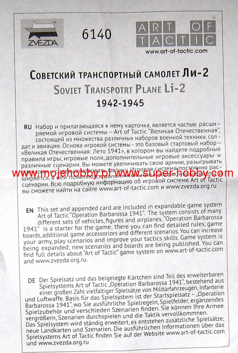 Сборная модель - Советский транспортный самолет Ли-2 (1942-1945). Историческая справка: Ли-2 является военным вариантом самолёта ПС-84. Планировалось, что он станет основным транспортным самолётом ВВС РККА. Однако, Война не позволила реализовать задумку. Ли-2 получил оборонительное вооружение и стал воевать. Использовался для заброса парашютистов в тыл противника, перевозки командного состава и раненых, высадки десантов и грузов в расположение войск и партизан. Использование самолета в Art of Tactic: В игре ЛИ-2 является транспортным самолётом. Способен десантировать десантные войска и грузы. Набор деталей из пластмассы для сборки одной модели самолета. Краски продаются отдельно от набора. Состав набора: 1 неокрашенный самолет 1 подставка