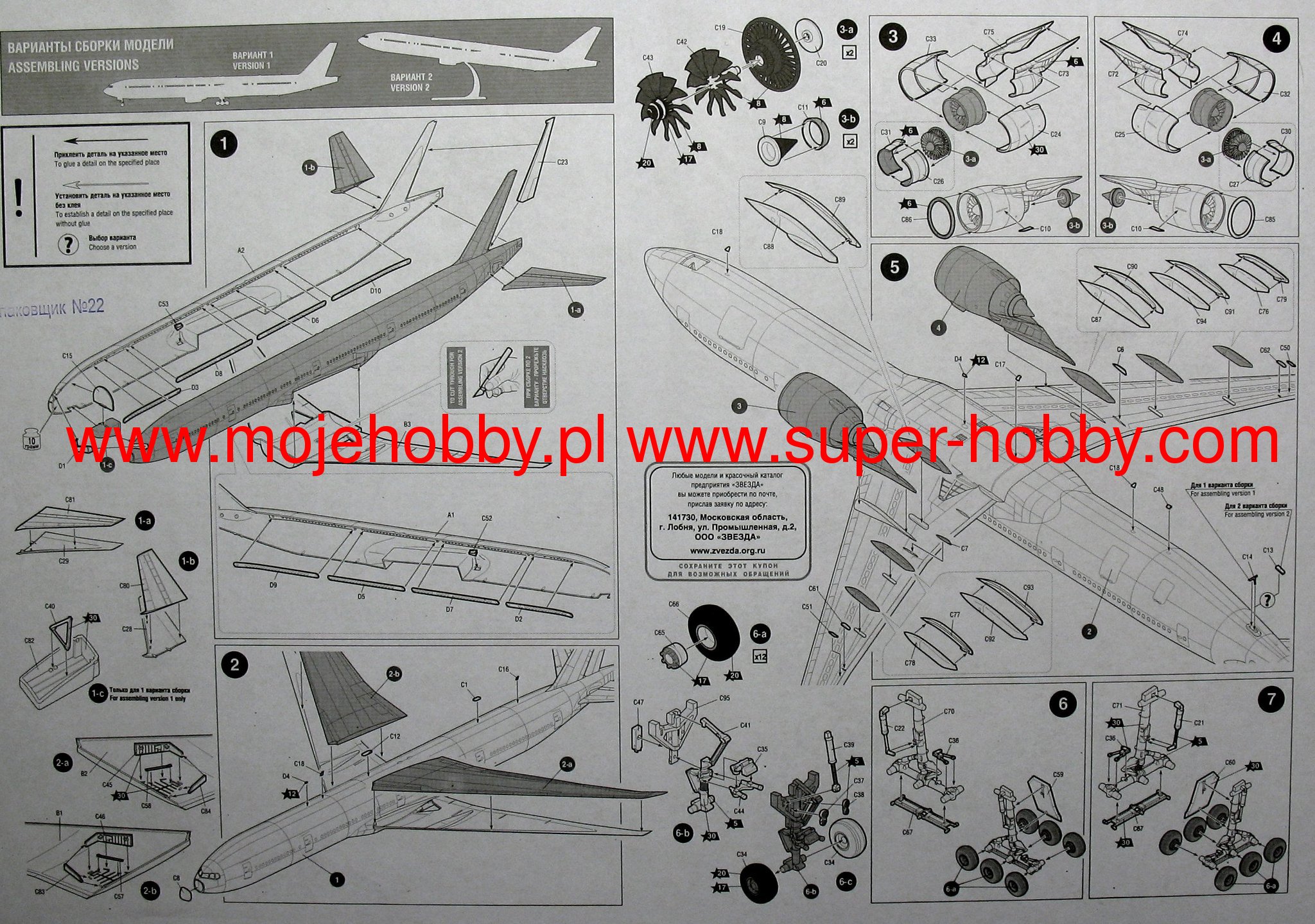 Сборная модель - Пассажирский авиалайнер Боинг 777-300 ER. Широкофюзеляжный лайнер для авиалиний большой протяжённости. Это самый крупный в мире двухмоторный реактивный пассажирский самолёт: его размах крыла больше, чем протяжённость первого полёта братьев Райт, а диаметр его двигателей Дженерал Электрик лишь на 30 см не дотягивает до ширины салона Боинга 737. Боинг 777 установил абсолютный рекорд дальности для пассажирских самолётов - 21601 км. Набор деталей из пластмассы для сборки одной модели самолета. Модель собирается при помощи специального клея, выпускаемого предприятием Звезда. Краски продаются отдельно от набора. Состав набора: отливки инструкция по сборке декаль