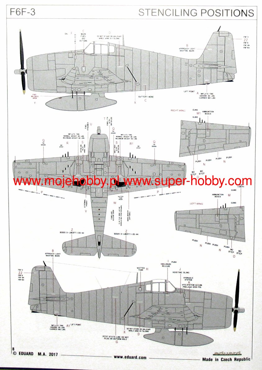 Grumman F6 Hellcat американский одномоторный полукорпусный истребитель времен Второй мировой войны с низкорасположенным крылом. F6 Hellcat был разработан как развитие успешной конструкции F4F. При его проектировании был использован 18-месячный опыт эксплуатации F4F на Тихом океане и многочисленные комментарии пилотов, воевавших на самолетах Wildcat. Конструктивно F6 Hellcat напоминал своего предшественника с одним существенным изменением. Использовалась система низкорасположенного крыла, которая позволяла убирать шасси в нижний центроплан, а не в фюзеляж. Это увеличило ширину колеи и устойчивость в движении на грунте. Дополнительно использована броня кабины и увеличен боекомплект. Оценка ВМС США предложения Груммана привела к тому, что в июне 1941 года был заказан четыре прототипа - от XF6F-1 до XF6F-4 - каждый с различной трансмиссией. Полет XF6F-1 состоялся через год после подписания контракта, но в связи с острой необходимостью усиления Уайлдкэтов (F4F) этот же планер оснастили самыми мощными из имеющихся двигателей Pratt-Whitney R-2800-10, благодаря чему самолет совершил свой очередной первый полет, на этот раз как XF6F-3. Еще до того, как этот второй полет состоялся, Грумману было поручено внедрить F6F-3 в производство как Hellcat. На данном этапе сходство F4F и F6F привело к сокращению сроков внедрения машины в серийное производство. Полет первой такой машины состоялся в конце 1942 г., а поставки на авианосец Эссекс начались в январе 1943 г. В августе того же года эскадрилья VF-5 с авианосца Йорктаун первой применила свои Хеллкэты против японский. Конструкция самолета была полностью металлической, соединялась закладными заклепками, а крылья складывались законцовками для облегчения ангара на палубе авианосца. Стандартное вооружение состояло из шести 12,7-мм пулеметов, установленных в носовой части крыла. Корпус и хвостовое оперение имели классическую конструкцию, отличаясь от F4F только габаритами. Трехопорная ходовая часть полностью убиралась при помощи гидросистемы, как и крюк для укорочения посадочного пробега. Просторная пилотская кабина была поднята высоко над плоскостью крыльев. Производство всех версий F6 превысило 12 200 экземпляров, а интенсивность его была настолько высока, что заменить ими использовавшиеся до сих пор F4F удалось очень быстро. Технические данные (для версии F6F-5): Максимальная скорость: 620 км/ч, скорость набора высоты: 14 м/с, практический потолок 11 400 м, максимальная дальность: 1 755 км, вооружение: стационарное - шесть 12,7-мм пулеметов Browning Подвесное - до 1800 кг бомб или дополнительный топливный бак. 3_edu7441_instruction_sheet.pdf