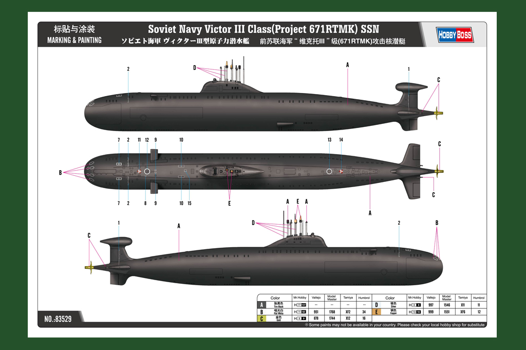 83529 ПОДВОДНАЯ ЛОДКА SOVIET NAVY VICTOR III CLASS (HOBBY BOSS) 1/350 (1/350) продается в 1 магазинах. Выберите подходящий Вам интернет-магазин и перейдите по ссылке «В магазин».