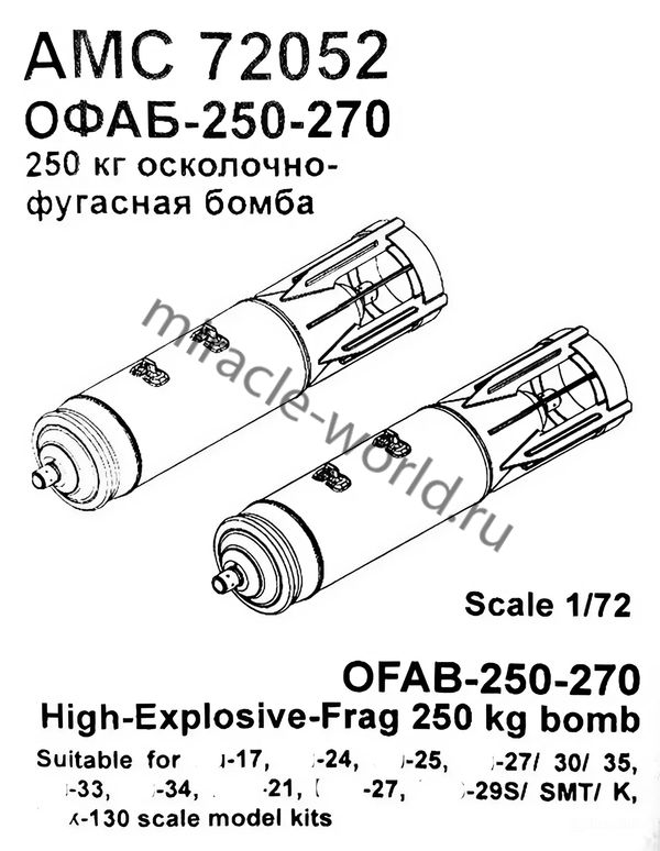 AM AMC 72052 ОФАБ-250-270 (4ШТ.) /ОСКОЛОЧНО - ФУГАСНАЯ АВИАЦИОННАЯ БОМБА, КАЛИБРА 250КГ./ 1/72 продается в 1 магазинах. Выберите подходящий Вам интернет-магазин и перейдите по ссылке «В магазин».