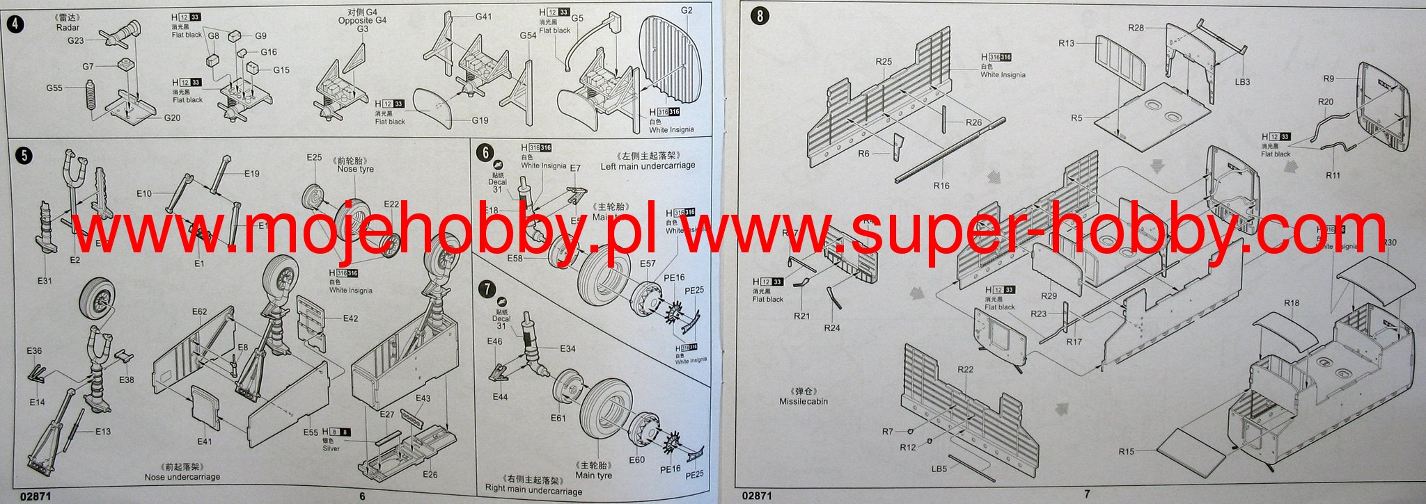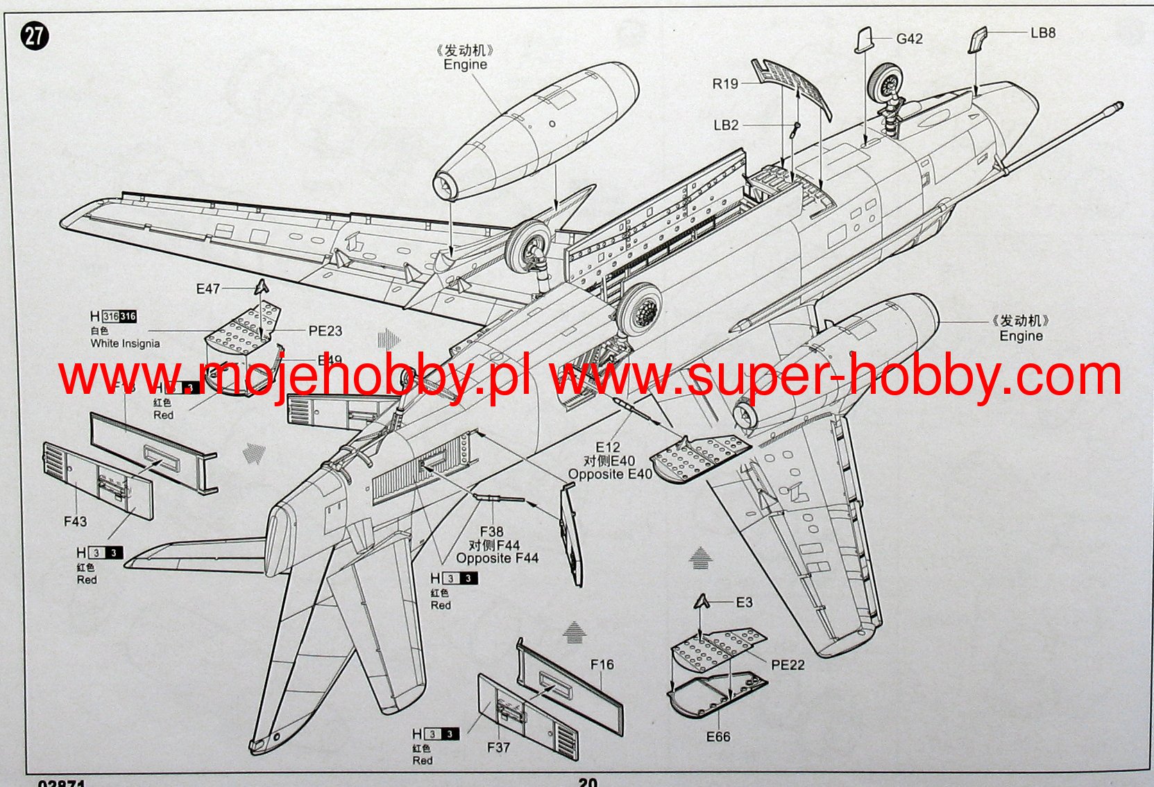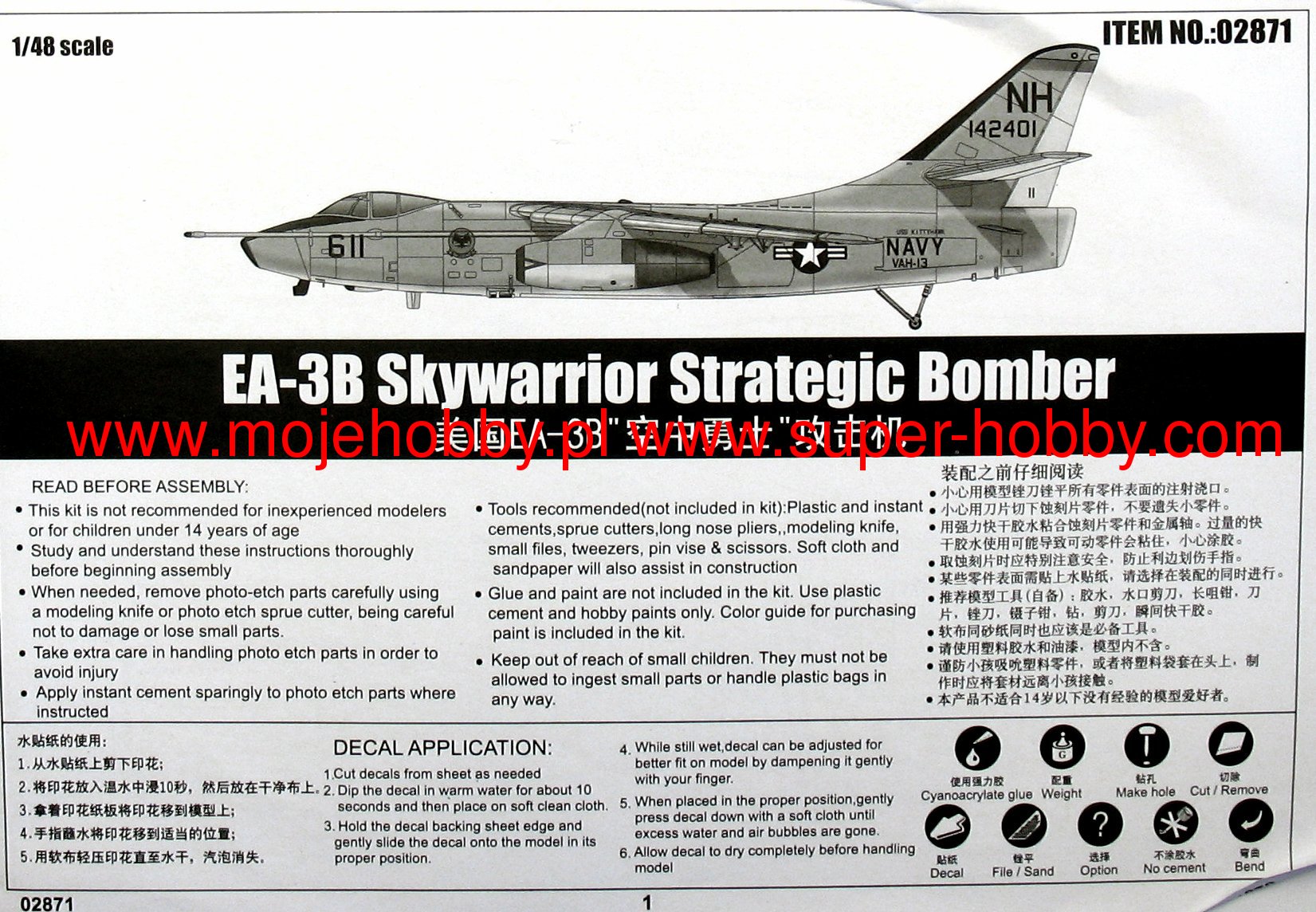 Дополнительная информация Douglas A-3 “Skywarrior” был стратегическим ядерным бомбардировщиком разработанным для ВМФ США. Самолёт имеет складываемые крылья для хранения под палубой, управляемую радаром турель и экипаж их трёх человек. Проект A-3 Skywarrior был запущен в 1947 году, первый прототип, XA3D-1, поднялся в воздух 28 октября 1952 года, самолёт был принят на вооружение в 1956 года, в 1961 производство прекращено. Всего компанией Douglas было построено 282 Skywarrior. Длина модели: 492,4 мм. размах крыльев: 460,5 мм. Количество деталей: 370.