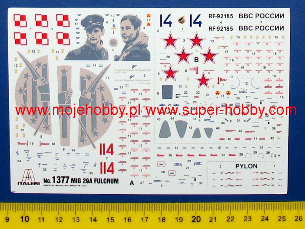 SUPER DECALS SHEET The Mikoyan MiG-29 Fulcrum is a twin-engine supersonic air-superiority fighter designed during the’70s to counter new American planes, such as McDonnell Douglas F-15. It entered in service in the Soviet Union Air Force in the early 80s. Thanks to its two Klimov RD-33 afterburning turbofan engines, the Fulcrum is able to reach the maximum speed of Mach 2,2. It is characterized by a very elegant and harmonious aerodynamic profile with a flat and wide fuselage and two vertical tail fins. The Mig 29 is armed with a 30 mm. gun in the port wing root and it can adopt a wide variety of air-to-air missiles ad the AA-8 “Aphid”, the AA-10 “Alamo” and the AA-11 “Archer”. It is widely used by the Russian Air Force and by the most part of Easter European Countries Air Forces. Among the others it has been adopted by the Indian Air Force.