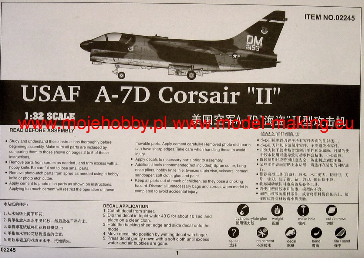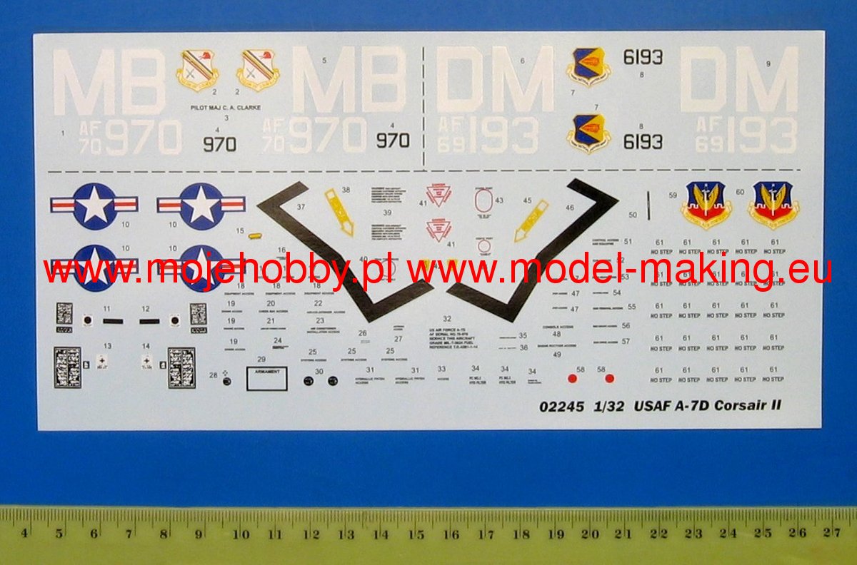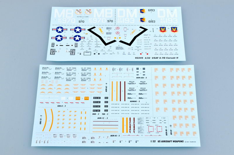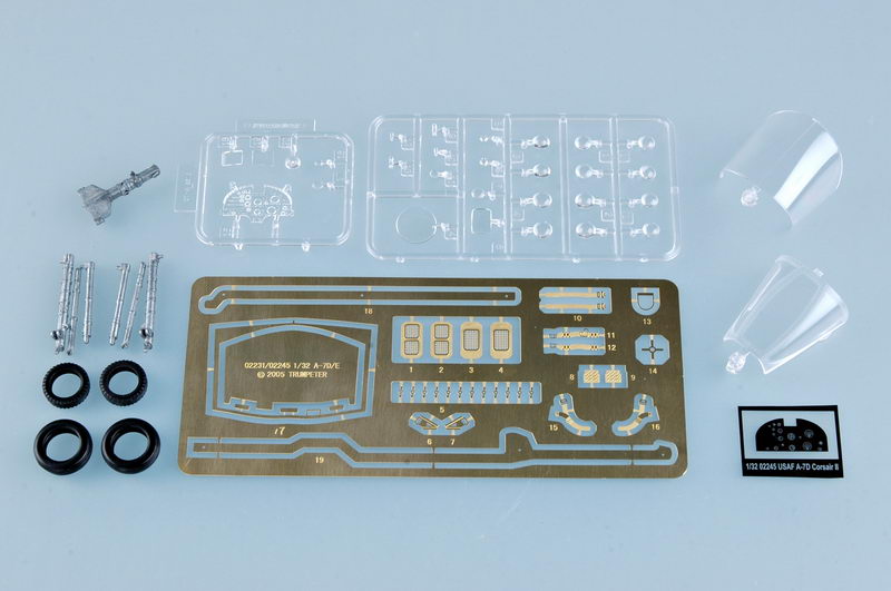 Дополнительная информация Модель Cамолет USAF A-7D Corsair II в масщтабе 1/32 состоит из: набора литников,доп.деталей для сборки модели, фототравления, инструкции. A-7D "Пират II" - одноместный штурмовик. Хотя он в основном разработан как штурмовик, он также обладает определенными возможностями воздушного боя. Его дизайн произошел от базовой A-7, разработанной ВМС США. Первый A-7D совершил свой первый полет 5 апреля 1968 года, а серийные модели были поставлены на производство с 23 декабря 1968 года. Когда производство A-7D закончилось в 1976 году, бто 459 самолетов были доставлены в ВВС США. В 1973 году ВВС США начали оснащать A-7D Воздушную Национальную Гвардию. Автоматическая система навигации и доставки оружия, используемая "Пиратом II", позволила его атакам имеет высокую точность. Размах крыла: 11,8 м, полная длина: 14 м, полная высота: 4,9 м, вес: 17 837 кг, оружие: пушка 20 мм M61A1, 6804 кг, нагрузка, двигатель: турбовентиляторный двигатель TF41, тяга 6 464 кг. Экипаж: максимум 1 человек. Скорость: 1067 км / ч. Крейсерская скорость: 877 км / ч. Дальность полета: 4 834 км. Предел подъема: 10 211 метров.