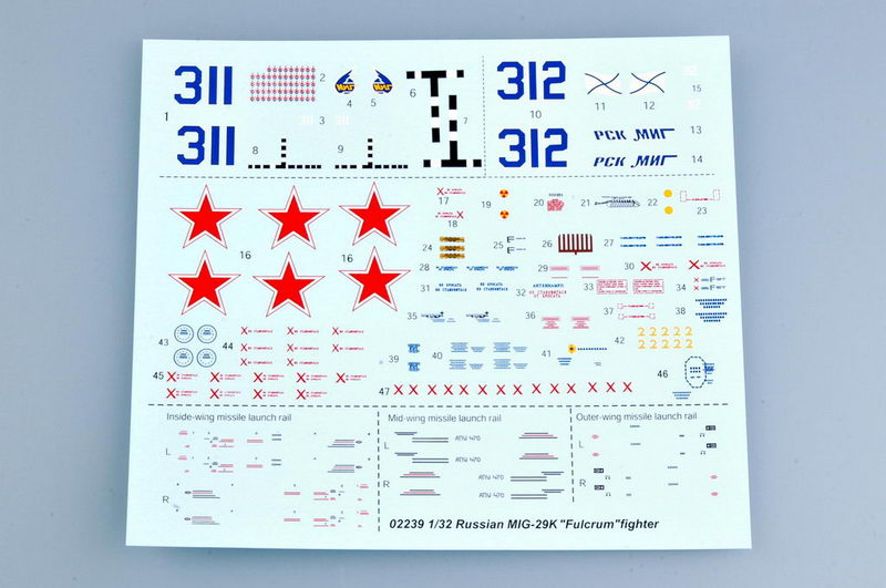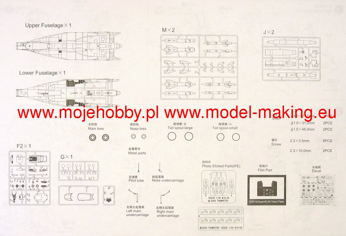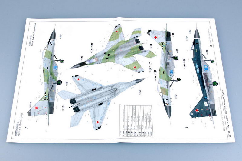 Описание М&G-29 (по кодификации НАТО: Fulcrum Точка опоры) советский и российский многоцелевой истребитель четвёртого поколения, разработанный в 1970-х годах в Опытном конструкторском бюро имени А. И. М&G-29 предназначен для уничтожения управляемыми ракетами и огнём из бортовой пушки всех типов воздушных целей в простых и сложных метеоусловиях в свободном пространстве и на фоне земли, в том числе в условиях помех, а также для поражения наземных целей с применением неуправляемых средств поражения в условиях визуальной видимости М&G-29К (9-31) многофункциональный истребитель корабельного базирования поколения 4+. Создан на базе самолёта М&G-29М (9-15), степень унификации с которым составляет 80-85%. Построено два опытных экземпляра № 311 и № 312. Лётчик-испытатель Т. О. Аубакиров 1 ноября 1989 года выполнил на М&G-29К № 311 первый в истории ВМФ России взлёт с палубы ТАВКР Тбилиси (с 1991 года Адмирал Флота Советского Союза Кузнецов). В связи с началом серийного производства корабельных истребителей С-27К и отказом от строительства новых авианесущих кораблей, работы по теме М&G-29К в начале 1990-х годов были приостановлены. М&G-29К (9-41) многофункциональный истребитель корабельного базирования. Построен на основе проекта М&G-29К (9-31) с учётом части наработок про проекту М&G-29М (9-61) и М&G-29UPG (9-20). В частности, использование композитных материалов. Эта модификация состоит на вооружении МА ВМФ России и МА Военно-морских сил Индии. Длина: 542,8 мм Размах крыльев: 375 мм Высота: 139,6 мм Всего деталей 506 шт Фототравление Всего литников 23шт