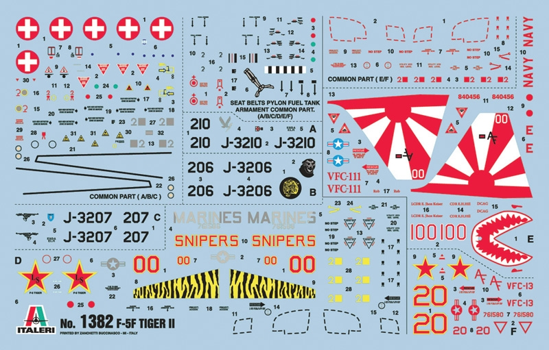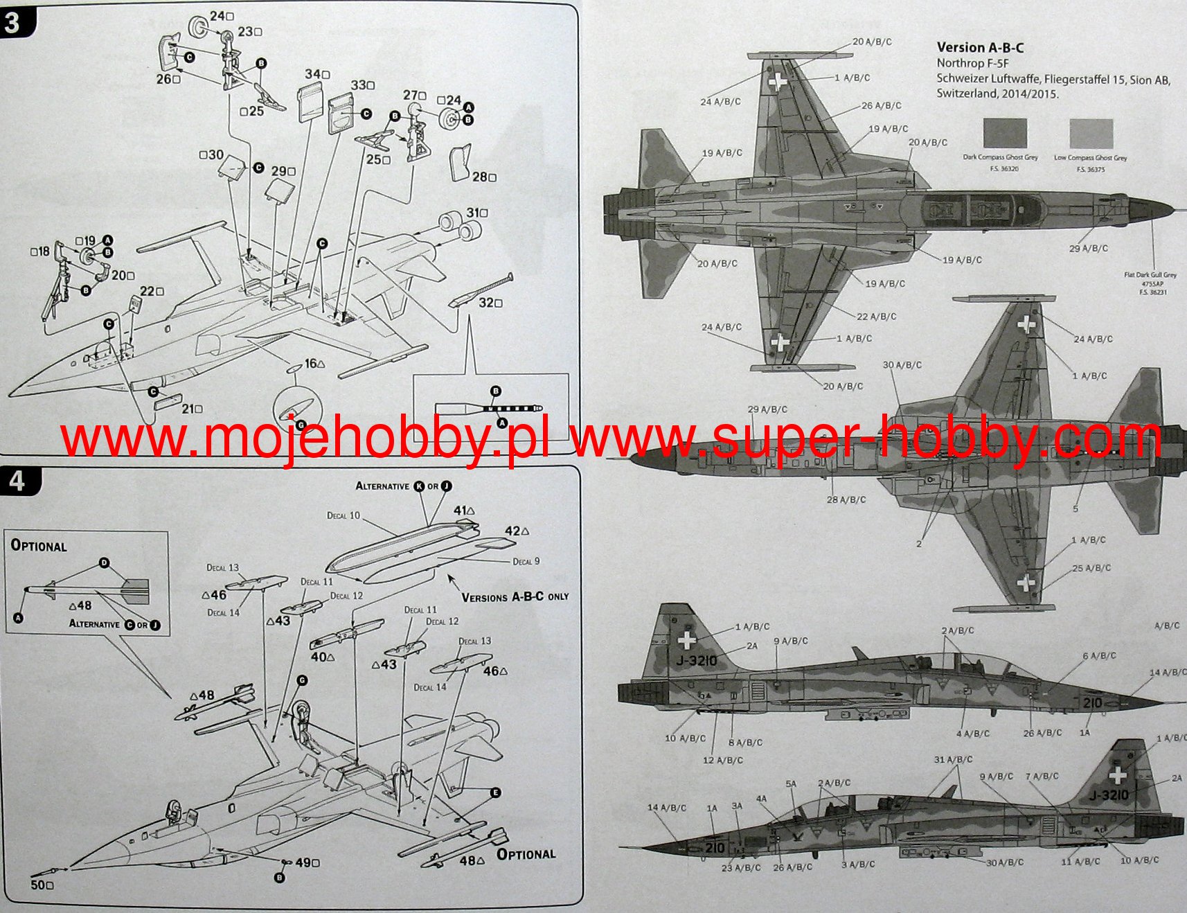 Developed in the early seventies from the American company Northrop, as direct evolution of its predecessor, the F-5E Tiger II was characterized by an increased power, a better maneuverability and better air-to-air performance. Its real strength, however, was represented by the low production and maintenance costs compared to a good combat effectiveness. Thanks to its cost / performance ratio the F-5E was chosen to equip the fighter squadrons of several air forces. Among these countries, the Swiss Air Force considered the F-5E suitable to meet the real unique features of which the Alpine Country needed. It was also produced under license by the Helvetic country. From the single-seat F-5E, the two-seat trainer F5-F has been directly derived. Armed with a single M39 gun, it keeps all the main operating features of the single-seat version.