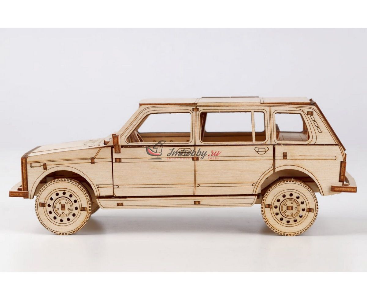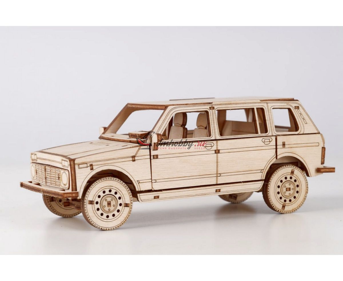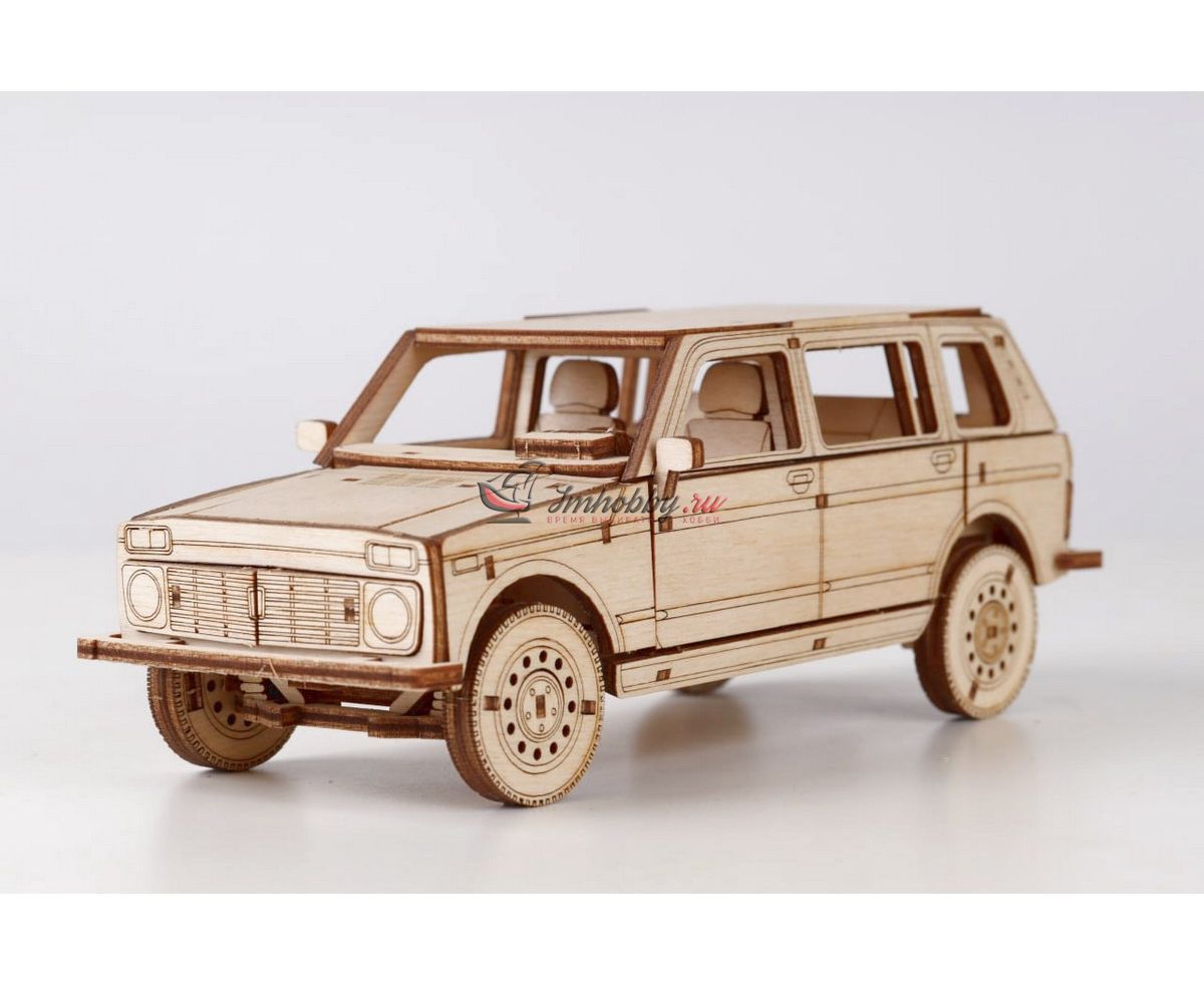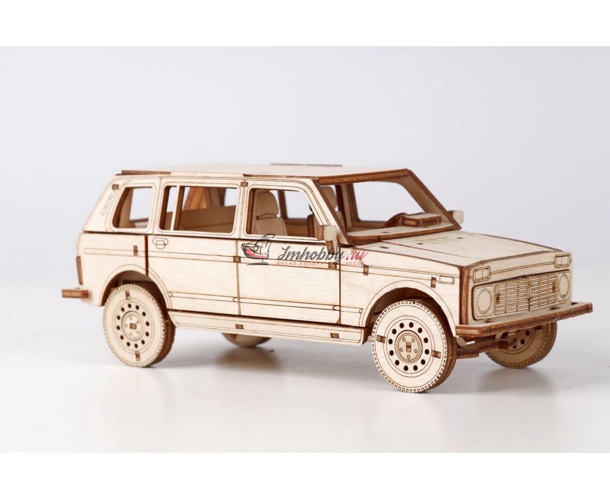 Сборная масштабная модель легкового автомобиля 2131 4x4 из фанеры. Детали изготовлены методом лазерной резки. Для сборки понадобятся столярный клей ПВА, модельный нож, надфиль (или наждачная бумага/губка). При желании модель можно окрасить или покрыть морилкой/лаком. Спецификации:Масштаб: 1:24Размеры: 177х80х68 ммКоличество деталей: 111Материал: ФанераПроизводитель: Baumi (Россия)