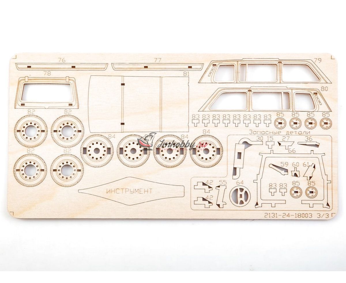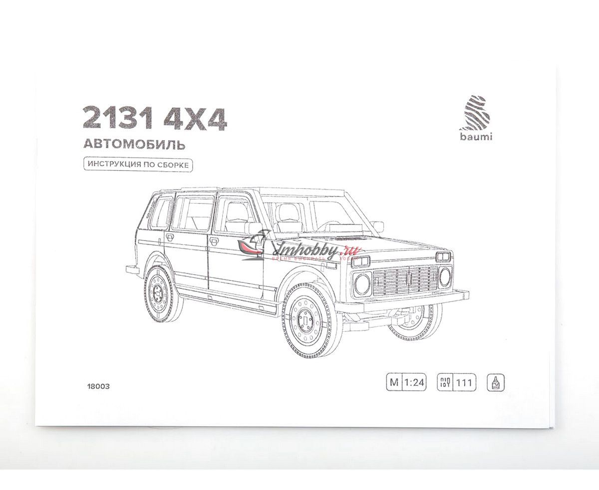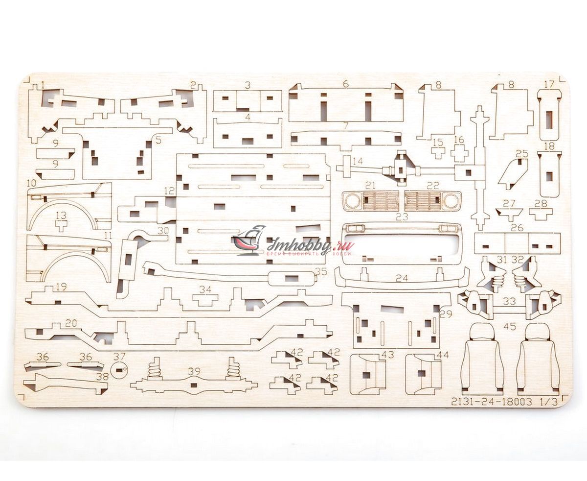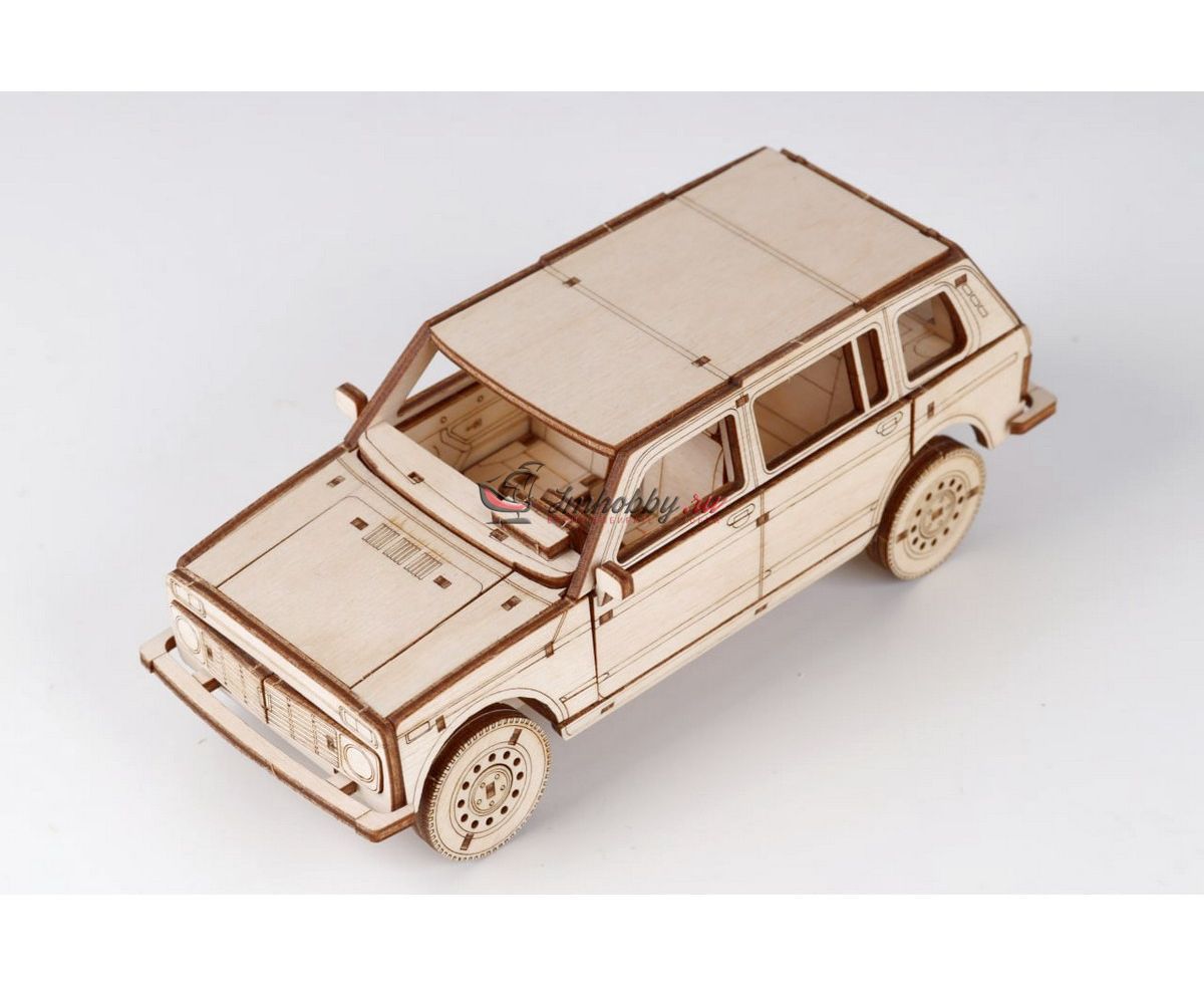 Сборная масштабная модель легкового автомобиля 2131 4x4 из фанеры. Детали изготовлены методом лазерной резки. Для сборки понадобятся столярный клей ПВА, модельный нож, надфиль (или наждачная бумага/губка). При желании модель можно окрасить или покрыть морилкой/лаком. Спецификации:Масштаб: 1:24Размеры: 177х80х68 ммКоличество деталей: 111Материал: ФанераПроизводитель: Baumi (Россия)