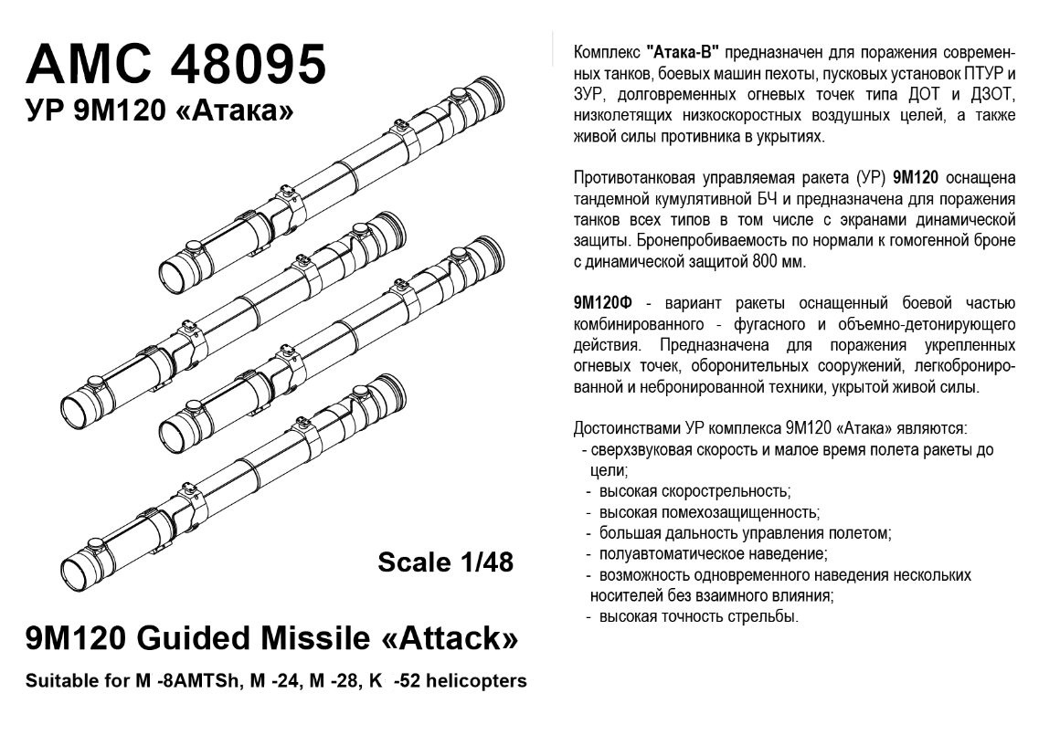 AMC 48095 ДОПОЛНЕНИЯ ИЗ СМОЛЫ ПТУР 9М120 "АТАКА" 4ШТ. (1/48) продается в 1 магазинах. Выберите подходящий Вам интернет-магазин и перейдите по ссылке «В магазин».
