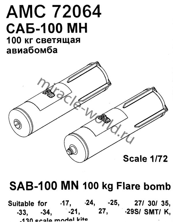 AM AMC 72064 САБ-100 МН /СВЕТЯЩАЯ АВИАЦИОННАЯ БОМБА, КАЛИБРА 100КГ./ 1/72 продается в 1 магазинах. Выберите подходящий Вам интернет-магазин и перейдите по ссылке «В магазин».