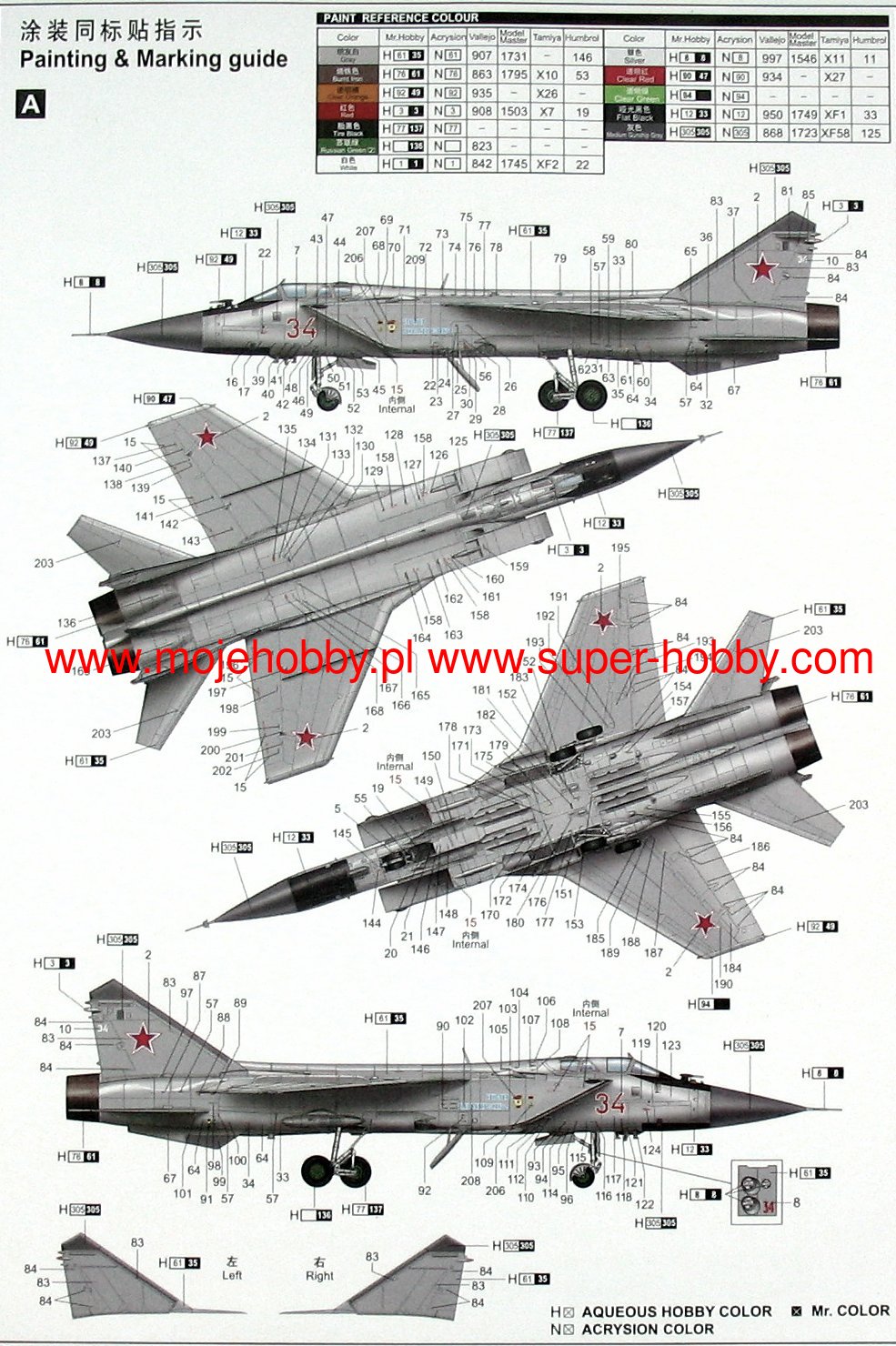Описание М&Г-31 (по НАТОвской классификации англ. Foxhound) советский и российский двухместный сверхзвуковой высотный всепогодный истребитель-перехватчик дальнего радиуса действия. Разработан в ОКБ-155 (ныне АО РСК М&Г) на базе М&Г-25 в 1970-х годах. Первый советский боевой самолёт четвёртого поколения. М&Г-31 предназначен для перехвата и уничтожения воздушных целей на предельно малых, средних и больших высотах, днём и ночью, в простых и сложных метеоусловиях, при применении противником активных и пассивных радиолокационных помех, а также ложных тепловых целей. Группа из четырёх самолётов М&Г-31 способна контролировать воздушное пространство протяжённостью по фронту до 1100 км. Изначально истребитель разрабатывали для перехвата авиационных крылатых ракет во всём диапазоне высот и скоростей, а также низколетящих спутников и автоматических дрейфующих аэростатов (АДА), запускаемых странами НАТО с 50-х годов над территорией СССР. Полки М&Г-31 несколько лет имели статус спецназа (СпН) в составе ПВО. М&Г-31БМ Модернизация 1998 года, современная версия М&Г-31 для ВВС России. Планируется до 2020 года модернизировать 60 М&Г-31 в М&Г-31БМ. В 2008 году завершён первый этап ГСИ, второй этап в 2012. Модернизированные самолёты получат новую систему управления вооружением и БРЛС, что позволит обнаруживать цели на дальности до 320 километров и одновременно сопровождать до десяти воздушных целей. 9-А-7660 Кинжал (в ряде источников Х-47М2 Кинжал) российский гиперзвуковой авиационный ракетный комплекс. Гиперзвуковые ракеты 9-С-7760 комплекса способны поражать как стационарные объекты, так и надводные корабли: авианосцы, крейсеры, эсминцы и фрегаты. Как сообщали Ведомости, по полученным из Объединённой авиастроительной корпорации сведениям, является авиационным вариантом комплекса Искандер. После успешных испытаний с 1 декабря 2017 года приступил к несению опытно-боевого дежурства на аэродромах Южного военного округа. В феврале-марте 2018 года начались эксплуатационные войсковые испытания ракетного комплекса. Длина: 314,6 мм Размах крыльев: 186,9 мм Всего деталей 210+ Всего 10 литников и фюзеляж