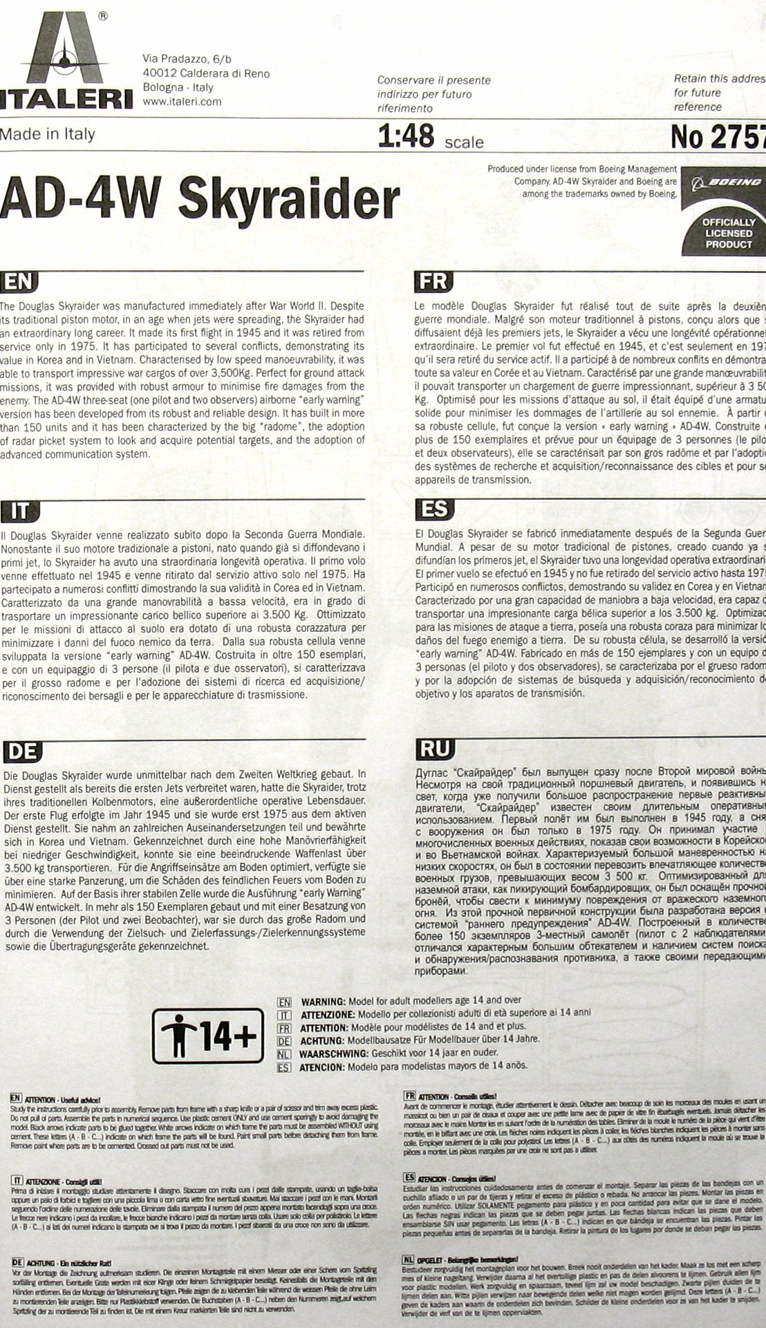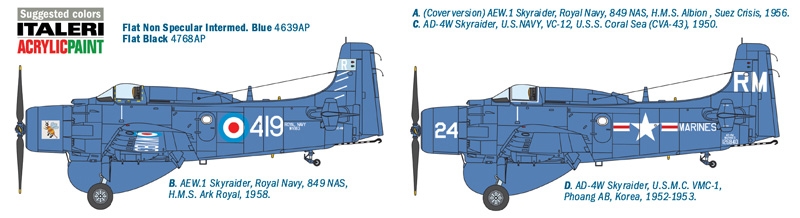 The Douglas Skyraider was manufactured immediately after War World II. Despite its traditional piston motor, in an age when jets were spreading, the Skyraider had an extraordinary long career. It made its first flight in 1945 and it was retired from service only in 1975. It has participated to several conflicts, demonstrating its value in Korea and in Vietnam. Characterised by low speed manoeuvrability, it was able to transport impressive war cargos of over 3,500Kg. Perfect for ground attack missions, it was provided with robust armour to minimise fire damages from the enemy. The AD-4W three-seat (one pilot and two observers) airborne “early warning” version has been developed from its robust and reliable design. It has built in more than 150 units and it has been characterized by the big “radome”, the adoption of radar picket system to look and acquire potential targets, and the adoption of advanced communication system.