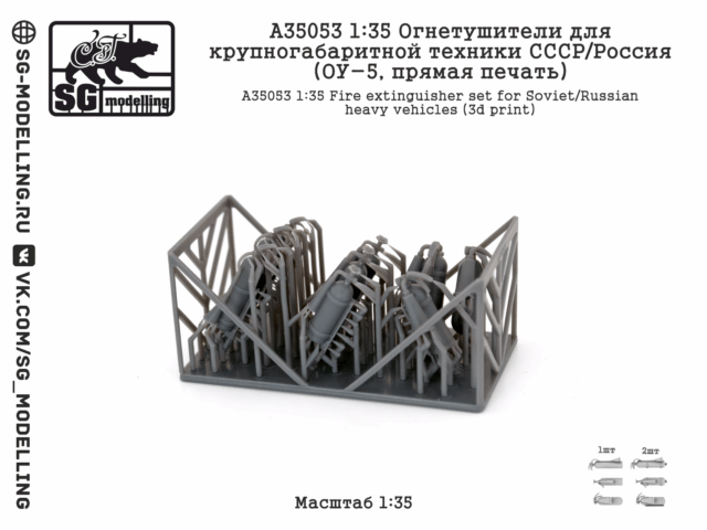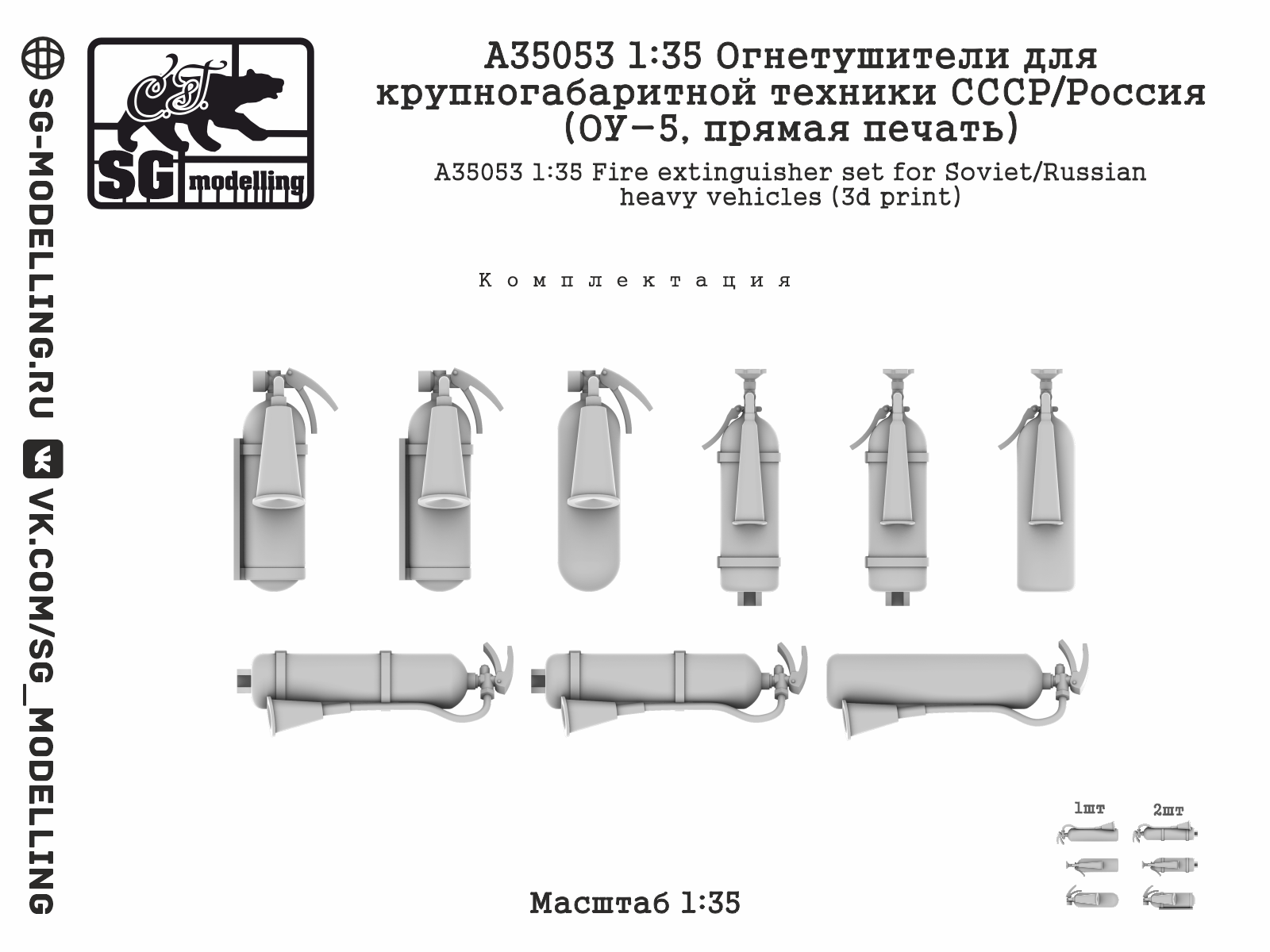 A35053 ДОПОЛНЕНИЯ ИЗ СМОЛЫ ОГНЕТУШИТЕЛИ ДЛЯ КРУПНОГАБ. ТЕХ. СССР/РОССИЯ ОУ-5, ПР. ПЕЧАТЬ (1/35) продается в 2 магазинах. Выберите подходящий Вам интернет-магазин и перейдите по ссылке «В магазин».