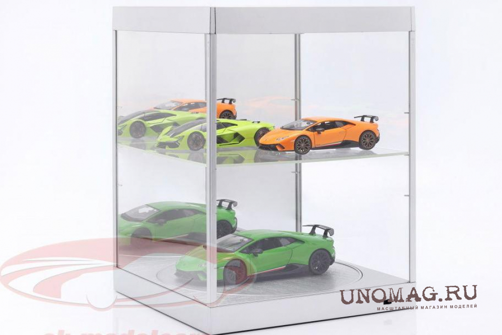 Купить ВИТРИНА СО СВЕТОДИОДНОЙ ПОДСВЕТКОЙ, ЗЕРКАЛОМ И ВРАЩАЮЩИМСЯ ПОДИУМОМ ДЛЯ МОДЕЛИ В МАСШТАБЕ 1:18, СЕРЕБРИСТАЯ (1/18)