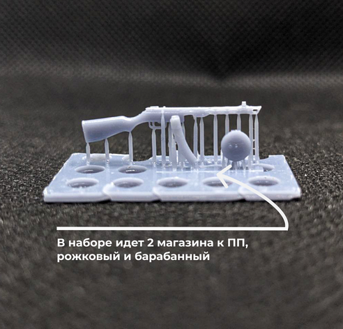 Описание Модели выполнены в 35м масштабе - самом распространенном масштабе для военно-исторических моделей. В наборе идет 5 штук моделей ПП ППШ, к каждому ПП идет два магазина рожковый и барабанный, что бы моделист мог выбрать, какой вариант подходит под воплощение его задумки. Модели произведены из фотополимерной смолы серого цвета с высокой степенью детализации. Модели поставляются в разобранном виде на поддержках для лучшей сохранности при транспортировке и неокрашенные. (Клей и краски не входят в набор) Склейка производится цианакрилатным клеем (монолит/секундный/супер клей/космофен). Клей и краски не входят в комплект.