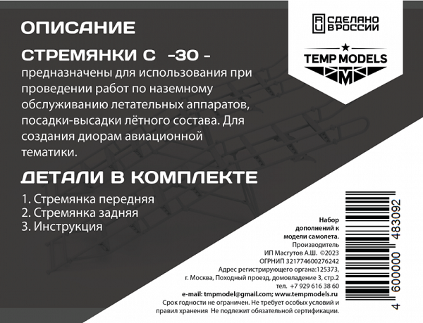Описание СТРЕМЯНКА ДЛЯ С-30 - предназначена для использования при проведении работ по наземному обслуживанию летательных аппаратов, посадки-высадки летного состава. Для создания диорам авиационной тематики.