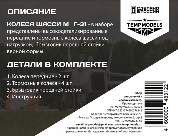 Описание КОЛЕСА ШАССИ M&G-31 - в наборе представлены высокодетализированные передние и тормозные колеса шасси под нагрузкой, брызговик передней стойки верной формы.
